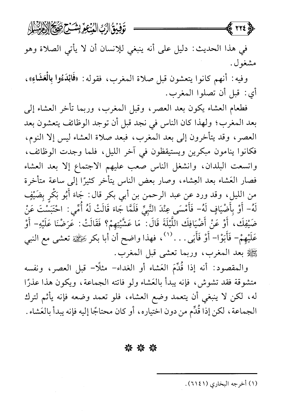 فطعام العشاء يكون بعد العصر، وقبل المغرب، وربما تأخر العشاء إلى بعد المغرب؛ ولهذا كان الناس في نجد قبل أن توجد الوظائف يتعشون بعد العصر، وقد يتأخرون إلى بعد المغرب، فبعد صلاة العشاء ليس إلا النوم، فكانوا ينامون مبكرين ويستيقظون في آخر الليل، فلما وجدت الوظائف، واتسعت البلدان، وانشغل الناس صعب عليهم الاجتماع إلا بعد العشاء فصار العَشاء بعد العِشاء، وصار بعض الناس يتأخر كثيرًا إلى ساعة متأخرة من الليل، وقد ورد عن عبدالرحمن بن أبي بكر قال: جَاءَ أَبُو بَكْرٍ بِضَيْفٍ لَهُ- أَوْ بِأَضْيَافٍ لَهُ- فَأَمْسَى عِنْدَ النَّبِيِّ فَلَمَّا جَاءَ قَالَتْ لَهُ أُمِّي: احْتَبَسْتَ عَنْ ضَيْفِكَ، أَوْ عَنْ أَضْيَافِكَ اللَّيْلَةَ قَالَ: مَا عَشَّيْتِهِمْ؟ فَقَالَتْ: عَرَضْنَا عَلَيْهِ- أَوْ عَلَيْهِمْ- فَأَبَوْا- أَوْ فَأَبَى ... (¬١)، فهذا واضح أن أبا بكر رضي الله عنه تعشى مع النبي صلى الله عليه وسلم بعد المغرب، وربما تعشى قبل المغرب.