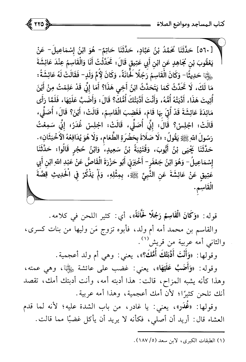 [٥٦٠] حَدَّثَنَا مُحَمَّدُ بْنُ عَبَّادٍ، حَدَّثَنَا حَاتِمٌ- هُوَ ابْنُ إِسْمَاعِيلَ- عَنْ يَعْقُوبَ بْنِ مُجَاهِدٍ عَنِ ابْنِ أَبِي عَتِيقٍ قَالَ: تَحَدَّثْتُ أَنَا وَالْقَاسِمُ عِنْدَ عَائِشَةَ رضي الله عنها حَدِيثًا- وَكَانَ الْقَاسِمُ رَجُلًا لَحَّانَةً، وَكَانَ لِأُمِّ وَلَدٍ- فَقَالَتْ لَهُ عَائِشَةُ: مَا لَكَ، لَا تَحَدَّثُ كَمَا يَتَحَدَّثُ ابْنُ أَخِي هَذَا؟ أَمَا إِنِّي قَدْ عَلِمْتُ مِنْ أَيْنَ أُتِيتَ هَذَا، أَدَّبَتْهُ أُمُّهُ، وَأَنْتَ أَدَّبَتْكَ أُمُّكَ؟ قَالَ: وَأَضَبَّ عَلَيْهَا، فَلَمَّا رَأَى مَائِدَةَ عَائِشَةَ قَدْ أُتِيَ بِهَا قَامَ، فَغَضِبَ الْقَاسِمُ، قَالَتْ: أَيْنَ؟ قَالَ: أُصَلِّي، قَالَتْ: اجْلِسْ؟ قَالَ: إِنِّي أُصَلِّي، قَالَتْ: اجْلِسْ غُدَرُ؛ إِنِّي سَمِعْتُ رَسُولَ اللَّهِ صلى الله عليه وسلم يَقُولُ: ((لَا صَلَاةَ بِحَضْرَةِ الطَّعَامِ، وَلَا هُوَ يُدَافِعُهُ الأَخْبَثَانِ)).
