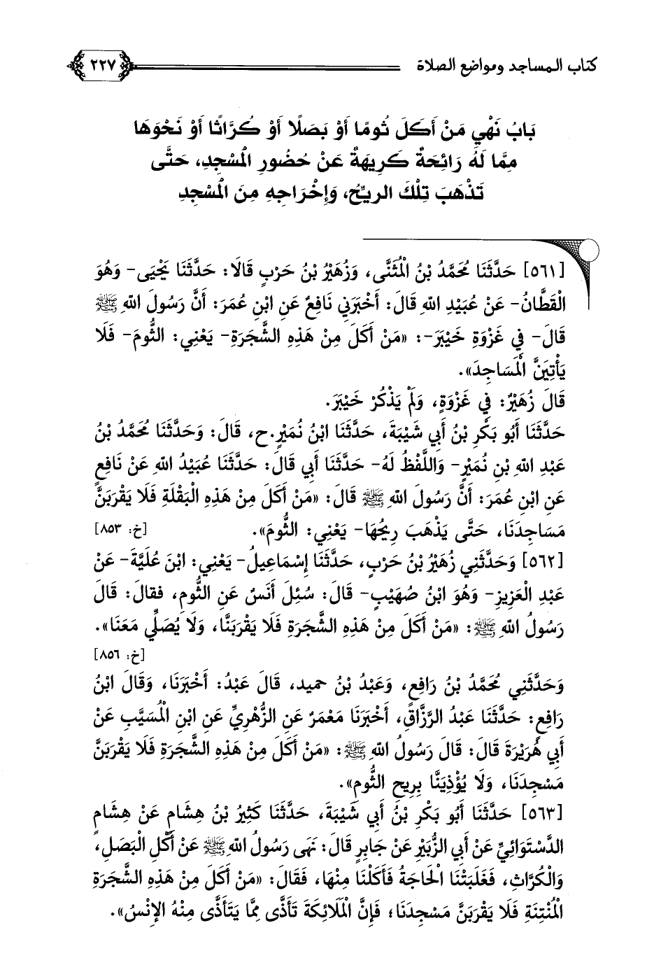 [٥٦٣] حَدَّثَنَا أَبُو بَكْرِ بْنُ أَبِي شَيْبَةَ، حَدَّثَنَا كَثِيرُ بْنُ هِشَامٍ عَنْ هِشَامٍ الدَّسْتَوَائِيِّ عَنْ أَبِي الزُّبَيْرِ عَنْ جَابِرٍ قَالَ: نَهَى رَسُولُ اللَّهِ صلى الله عليه وسلم عَنْ أَكْلِ الْبَصَلِ، وَالْكُرَّاثِ، فَغَلَبَتْنَا الْحَاجَةُ فَأَكَلْنَا مِنْهَا، فَقَالَ: ((مَنْ أَكَلَ مِنْ هَذِهِ الشَّجَرَةِ الْمُنْتِنَةِ فَلَا يَقْرَبَنَّ مَسْجِدَنَا، فَإِنَّ الْمَلَائِكَةَ تَأَذَّى مِمَّا يَتَأَذَّى مِنْهُ الإِنْسُ)).