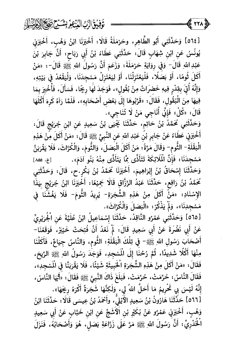 [٥٦٤] وَحَدَّثَنِي أَبُو الطَّاهِرِ، وحَرْمَلَةُ قَالَا: أَخْبَرَنَا ابْنُ وَهْبٍ، أَخْبَرَنِي يُونُسُ عَنِ ابْنِ شِهَابٍ قَالَ: حَدَّثَنِي عَطَاءُ بْنُ أَبِي رَبَاحٍ: أَنَّ جَابِرَ بْنَ عَبْدِ اللَّهِ قَالَ- وَفِي رِوَايَةِ حَرْمَلَةَ: وَزَعَمَ أَنَّ رَسُولَ اللَّهِ صلى الله عليه وسلم قَالَ-: ((مَنْ أَكَلَ ثُومًا، أَوْ بَصَلًا، فَلْيَعْتَزِلْنَا، أَوْ لِيَعْتَزِلْ مَسْجِدَنَا، وَلْيَقْعُدْ فِي بَيْتِهِ، وَإِنَّهُ أُتِيَ بِقِدْرٍ فِيهِ خَضِرَاتٌ مِنْ بُقُولٍ))، فَوَجَدَ لَهَا رِيحًا، فَسَأَلَ، فَأُخْبِرَ بِمَا فِيهَا مِنَ الْبُقُولِ، فَقَالَ: ((قَرِّبُوهَا إِلَى بَعْضِ أَصْحَابِهِ))، فَلَمَّا رَأَىهُ كَرِهَ أَكْلَهَا قَالَ: ((كُلْ، فَإِنِّي أُنَاجِي مَنْ لَا تُنَاجِي)).