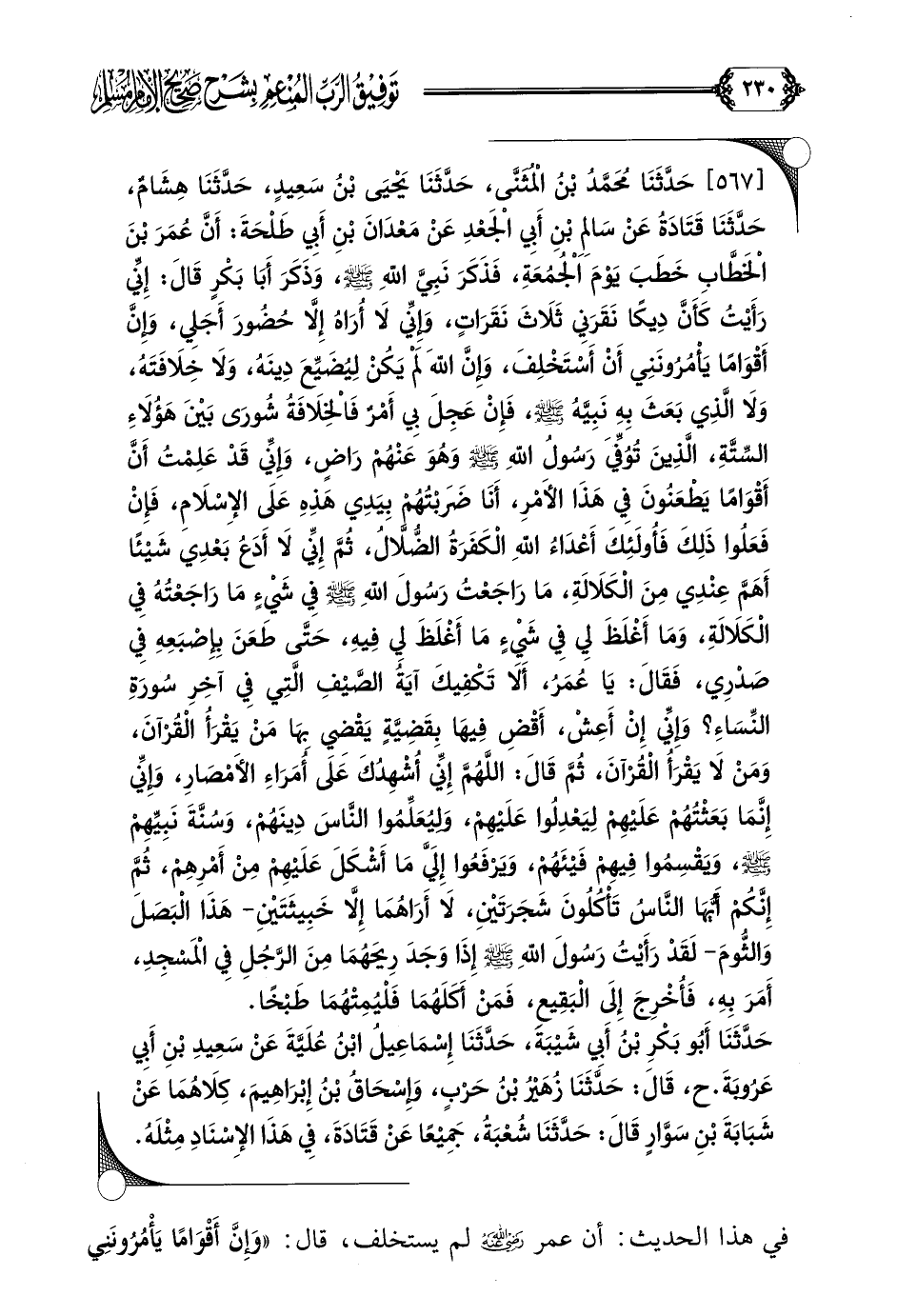 [٥٦٧] حَدَّثَنَا مُحَمَّدُ بْنُ الْمُثَنَّى، حَدَّثَنَا يَحْيَى بْنُ سَعِيدٍ، حَدَّثَنَا هِشَامٌ، حَدَّثَنَا قَتَادَةُ عَنْ سَالِمِ بْنِ أَبِي الْجَعْدِ عَنْ مَعْدَانَ بْنِ أَبِي طَلْحَةَ: أَنَّ عُمَرَ بْنَ الْخَطَّابِ خَطَبَ يَوْمَ الْجُمُعَةِ، فَذَكَرَ نَبِيَّ اللَّهِ صلى الله عليه وسلم، وَذَكَرَ أَبَا بَكْرٍ قَالَ: إِنِّي رَأَيْتُ كَأَنَّ دِيكًا نَقَرَنِي ثَلَاثَ نَقَرَاتٍ، وَإِنِّي لَا أُرَاهُ إِلَّا حُضُورَ أَجَلِي، وَإِنَّ أَقْوَامًا يَأْمُرُونَنِي أَنْ أَسْتَخْلِفَ، وَإِنَّ اللَّهَ لَمْ يَكُنْ لِيُضَيِّعَ دِينَهُ، وَلَا خِلَافَتَهُ، وَلَا الَّذِي بَعَثَ بِهِ نَبِيَّهُ صلى الله عليه وسلم، فَإِنْ عَجِلَ بِي أَمْرٌ فَالْخِلَافَةُ شُورَى بَيْنَ هَؤُلَاءِ السِّتَّةِ، الَّذِينَ تُوُفِّيَ رَسُولُ اللَّهِ صلى الله عليه وسلم وَهُوَ عَنْهُمْ رَاضٍ، وَإِنِّي قَدْ عَلِمْتُ أَنَّ أَقْوَامًا يَطْعَنُونَ فِي هَذَا الأَمْرِ، أَنَا ضَرَبْتُهُمْ بِيَدِي هَذِهِ عَلَى الإِسْلَامِ، فَإِنْ فَعَلُوا ذَلِكَ فَأُولَئِكَ أَعْدَاءُ اللَّهِ الْكَفَرَةُ الضُّلَّالُ، ثُمَّ إِنِّي لَا أَدَعُ بَعْدِي شَيْئًا أَهَمَّ عِنْدِي مِنَ الْكَلَالَةِ، مَا رَاجَعْتُ رَسُولَ اللَّهِ صلى الله عليه وسلم فِي شَيْءٍ مَا رَاجَعْتُهُ فِي الْكَلَالَةِ، وَمَا أَغْلَظَ لِي فِي شَيْءٍ مَا أَغْلَظَ لِي فِيهِ، حَتَّى طَعَنَ بِإِصْبَعِهِ فِي صَدْرِي، فَقَالَ: يَا عُمَرُ، أَلَا تَكْفِيكَ آيَةُ الصَّيْفِ الَّتِي فِي آخِرِ سُورَةِ النِّسَاءِ؟ وَإِنِّي إِنْ أَعِشْ، أَقْضِ فِيهَا بِقَضِيَّةٍ يَقْضِي بِهَا مَنْ يَقْرَأُ الْقُرْآنَ، وَمَنْ لَا يَقْرَأُ الْقُرْآنَ، ثُمَّ قَالَ: اللَّهُمَّ إِنِّي أُشْهِدُكَ عَلَى أُمَرَاءِ الأَمْصَارِ، وَإِنِّي إِنَّمَا بَعَثْتُهُمْ عَلَيْهِمْ لِيَعْدِلُوا عَلَيْهِمْ، وَلِيُعَلِّمُوا النَّاسَ
