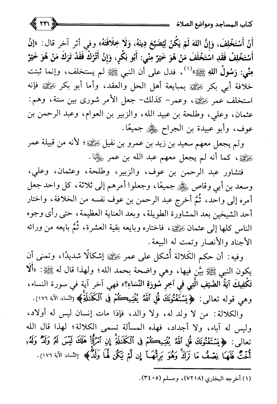 أَنْ أَسْتَخْلِفَ، وَإِنَّ اللَّهَ لَمْ يَكُنْ لِيُضَيِّعَ دِينَهُ، وَلَا خِلَافَتَهُ)) وفي أثر آخر قال: ((إنْ أَسْتَخْلِفْ، فَقَدِ اسْتَخْلَفَ مَنْ هُوَ خَيْرٌ مِنِّي: أَبُو بَكْرٍ، وَإِنْ أَتْرُكْ فَقَدْ تَرَكَ مَنْ هُوَ خَيْرٌ مِنِّي: رَسُولُ اللَّهِ صلى الله عليه وسلم)) (¬١)، فدل على أن النبي عليه الصلاة والسلام لم يستخلف، وإنما ثبتت خلافة أبي بكر رضي الله عنه بمبايعة أهل الحل والعقد، وأما أبو بكر رضي الله عنه فإنه استخلف عمر رضي الله عنه، وعمر- كذلك- جعل الأمر شورى بين ستة، وهم: عثمان، وعلي، وطلحة بن عبيد الله، والزبير بن العوام، وعبد الرحمن بن عوف، وأبو عبيدة بن الجراح رضي الله عنهم جميعًا.