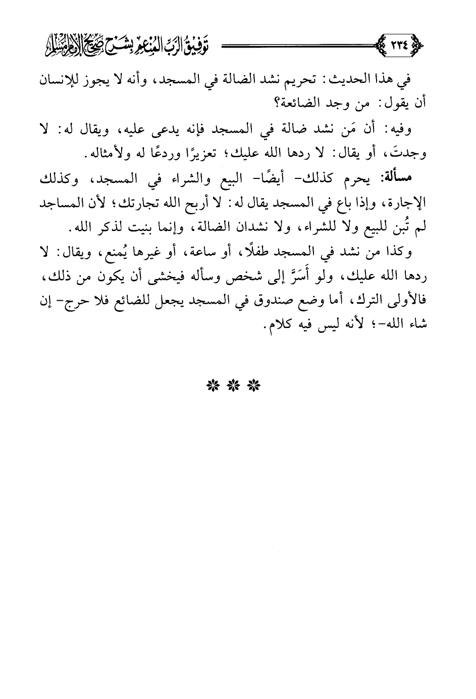 مسألة: يحرم كذلك- أيضًا- البيع والشراء في المسجد، وكذلك الإجارة، وإذا باع في المسجد يقال له: لا أربح الله تجارتك؛ لأن المساجد لم تُبن للبيع ولا للشراء، ولا نشدان الضالة، وإنما بنيت لذكر الله.