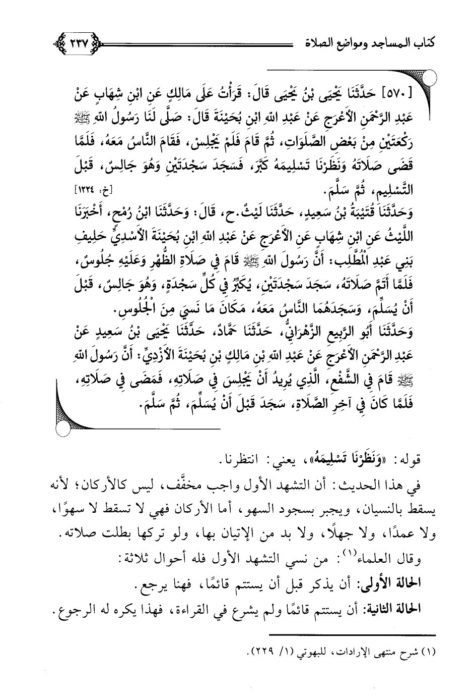 [٥٧٠] حَدَّثَنَا يَحْيَى بْنُ يَحْيَى قَالَ: قَرَأْتُ عَلَى مَالِكٍ عَنِ ابْنِ شِهَابٍ عَنْ عَبْدِ الرَّحْمَنِ الأَعْرَجِ عَنْ عَبْدِ اللَّهِ ابْنِ بُحَيْنَةَ قَالَ: صَلَّى لَنَا رَسُولُ اللَّهِ صلى الله عليه وسلم رَكْعَتَيْنِ مِنْ بَعْضِ الصَّلَوَاتِ، ثُمَّ قَامَ فَلَمْ يَجْلِسْ، فَقَامَ النَّاسُ مَعَهُ، فَلَمَّا قَضَى صَلَاتَهُ وَنَظَرْنَا تَسْلِيمَهُ كَبَّرَ، فَسَجَدَ سَجْدَتَيْنِ وَهُوَ جَالِسٌ، قَبْلَ التَّسْلِيمِ، ثُمَّ سَلَّمَ.