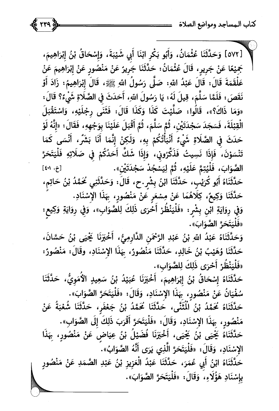 [٥٧٢] وَحَدَّثَنَا عُثْمَانُ، وَأَبُو بَكْرِ ابْنَا أَبِي شَيْبَةَ، وَإِسْحَاقُ بْنُ إِبْرَاهِيمَ، جَمِيْعًا عَنْ جَرِيرٍ، قَالَ عُثْمَانُ: حَدَّثَنَا جَرِيرٌ عَنْ مَنْصُورٍ عَنْ إِبْرَاهِيمَ عَنْ عَلْقَمَةَ قَالَ: قَالَ عَبْدُ اللَّهِ: صَلَّى رَسُولُ اللَّهِ صلى الله عليه وسلم، قَالَ إِبْرَاهِيمُ: زَادَ أَوْ نَقَصَ: فَلَمَّا سَلَّمَ، قِيلَ لَهُ: يَا رَسُولَ اللَّهِ، أَحَدَثَ فِي الصَّلَاةِ شَيْءٌ؟ قَالَ: ((وَمَا ذَاكَ؟ ))، قَالُوا: صَلَّيْتَ كَذَا وَكَذَا قَالَ: فَثَنَى رِجْلَيْهِ، وَاسْتَقْبَلَ الْقِبْلَةَ، فَسَجَدَ سَجْدَتَيْنِ، ثُمَّ سَلَّمَ، ثُمَّ أَقْبَلَ عَلَيْنَا بِوَجْهِهِ، فَقَالَ: ((إِنَّهُ لَوْ حَدَثَ فِي الصَّلَاةِ شَيْءٌ أَنْبَأْتُكُمْ بِهِ، وَلَكِنْ إِنَّمَا أَنَا بَشَرٌ، أَنْسَى كَمَا تَنْسَوْنَ، فَإِذَا نَسِيتُ فَذَكِّرُونِي، وَإِذَا شَكَّ أَحَدُكُمْ فِي صَلَاتِهِ فَلْيَتَحَرَّ الصَّوَابَ، فَلْيُتِمَّ عَلَيْهِ، ثُمَّ لِيَسْجُدْ سَجْدَتَيْنِ)).