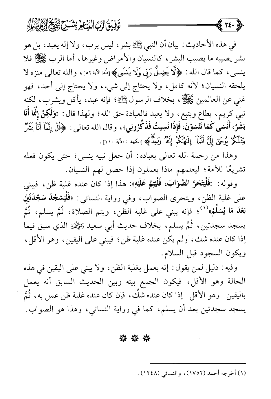في هذه الأحاديث: بيان أن النبي صلى الله عليه وسلم بشر، ليس برب، ولا إله يعبد، بل هو بشر يصيبه ما يصيب البشر، كالنسيان والأمراض وغيرها، أما الرب سبحانه وتعالى فلا ينسى، كما قال الله: {لا يضل ربي ولا ينسى}، والله تعالى منزه لا يلحقه النسيان؛ لأنه كامل، ولا يحتاج إلى شيء، ولا يحتاج إلى أحد، فهو غني عن العالمين سبحانه وتعالى، بخلاف الرسول صلى الله عليه وسلم؛ فإنه عبد، يأكل ويشرب، لكنه نبي كريم، يطاع ويتبع، ولا يعبد فالعبادة حق الله؛ ولهذا قال: ((وَلَكِنْ إِنَّمَا أَنَا بَشَرٌ، أَنْسَى كَمَا تَنْسَوْنَ، فَإِذَا نَسِيتُ فَذَكِّرُونِي))، وقال الله تعالى: {قل إنما أنا بشر مثلكم يوحى إلي أنما إلهكم إله واحد}.