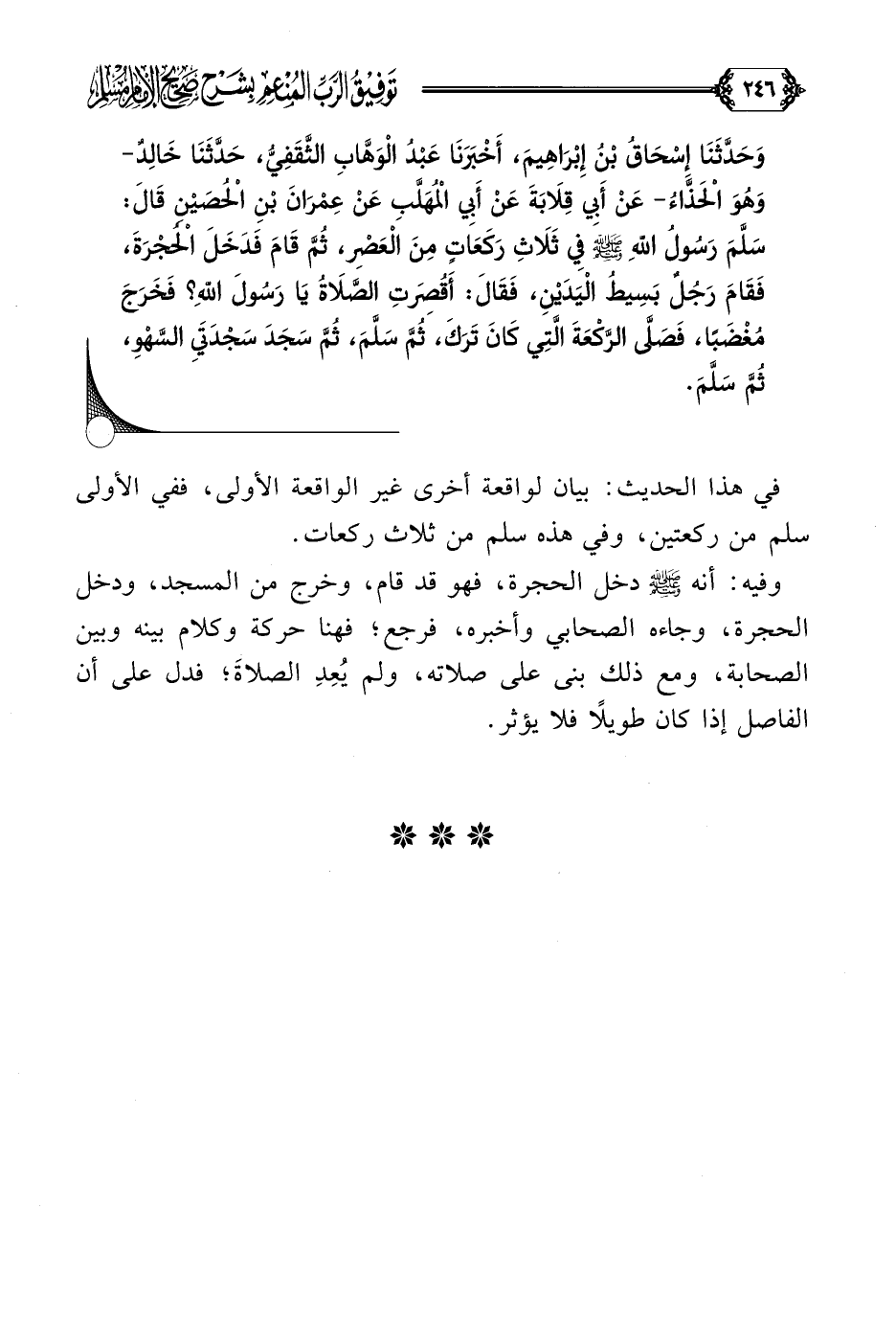 وَحَدَّثَنَا إِسْحَاقُ بْنُ إِبْرَاهِيمَ، أَخْبَرَنَا عَبْدُ الْوَهَّابِ الثَّقَفِيُّ، حَدَّثَنَا خَالِدٌ- وَهُوَ الْحَذَّاءُ- عَنْ أَبِي قِلَابَةَ عَنْ أَبِي الْمُهَلَّبِ عَنْ عِمْرَانَ بْنِ الْحُصَيْنِ قَالَ: سَلَّمَ رَسُولُ اللَّهِ صلى الله عليه وسلم فِي ثَلَاثِ رَكَعَاتٍ مِنَ الْعَصْرِ، ثُمَّ قَامَ فَدَخَلَ الْحُجْرَةَ، فَقَامَ رَجُلٌ بَسِيطُ الْيَدَيْنِ، فَقَالَ: أَقُصِرَتِ الصَّلَاةُ يَا رَسُولَ اللَّهِ؟ فَخَرَجَ مُغْضَبًا، فَصَلَّى الرَّكْعَةَ الَّتِي كَانَ تَرَكَ، ثُمَّ سَلَّمَ، ثُمَّ سَجَدَ سَجْدَتَيِ السَّهْوِ، ثُمَّ سَلَّمَ.