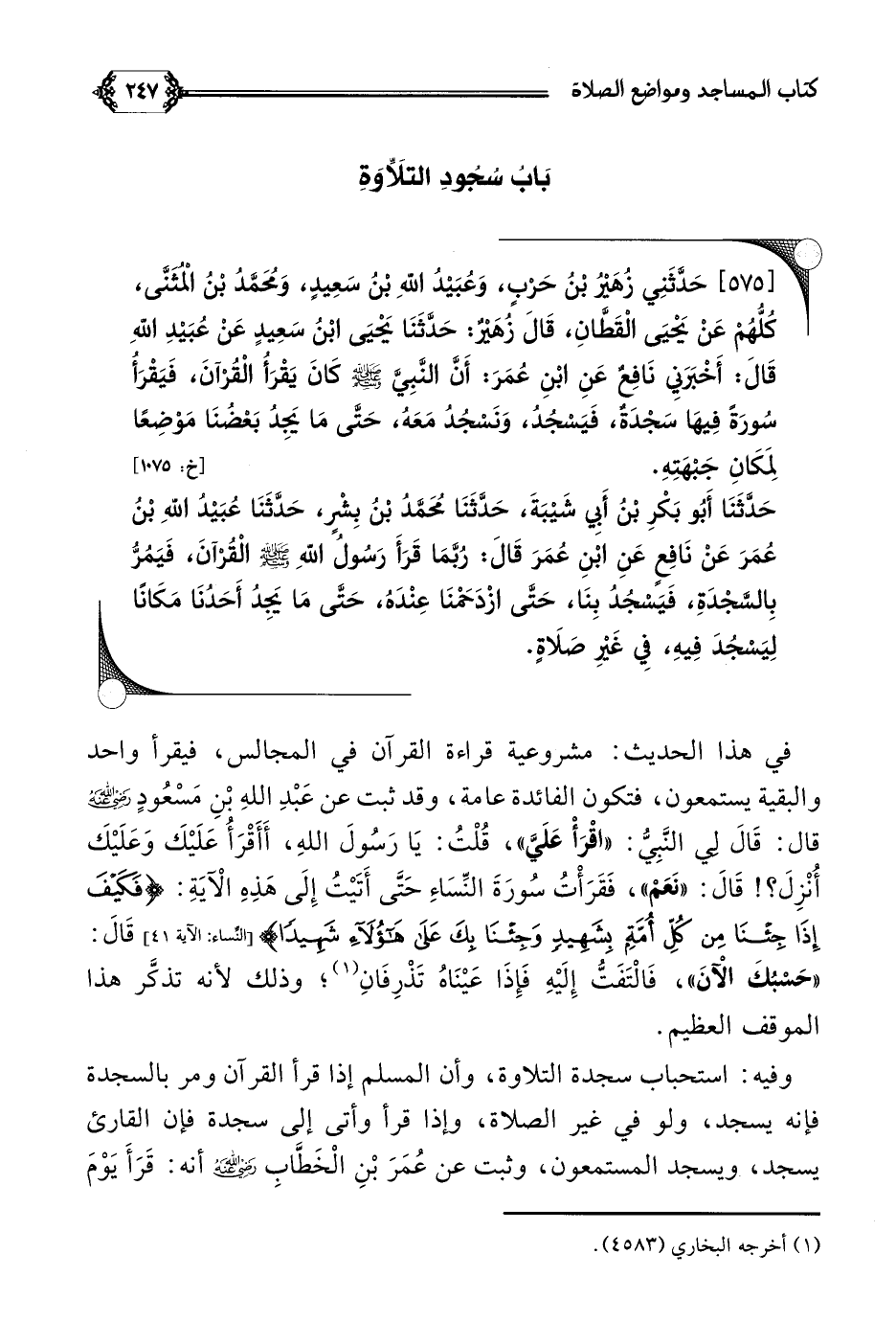 [٥٧٥] حَدَّثَنِي زُهَيْرُ بْنُ حَرْبٍ، وَعُبَيْدُ اللَّهِ بْنُ سَعِيدٍ، وَمُحَمَّدُ بْنُ الْمُثَنَّى، كُلُّهُمْ عَنْ يَحْيَى الْقَطَّانِ، قَالَ زُهَيْرٌ: حَدَّثَنَا يَحْيَى ابْنُ سَعِيدٍ عَنْ عُبَيْدِ اللَّهِ قَالَ: أَخْبَرَنِي نَافِعٌ عَنِ ابْنِ عُمَرَ: أَنَّ النَّبِيَّ صلى الله عليه وسلم كَانَ يَقْرَأُ الْقُرْآنَ، فَيَقْرَأُ سُورَةً فِيهَا سَجْدَةٌ، فَيَسْجُدُ، وَنَسْجُدُ مَعَهُ، حَتَّى مَا يَجِدُ بَعْضُنَا مَوْضِعًا لِمَكَانِ جَبْهَتِهِ.
