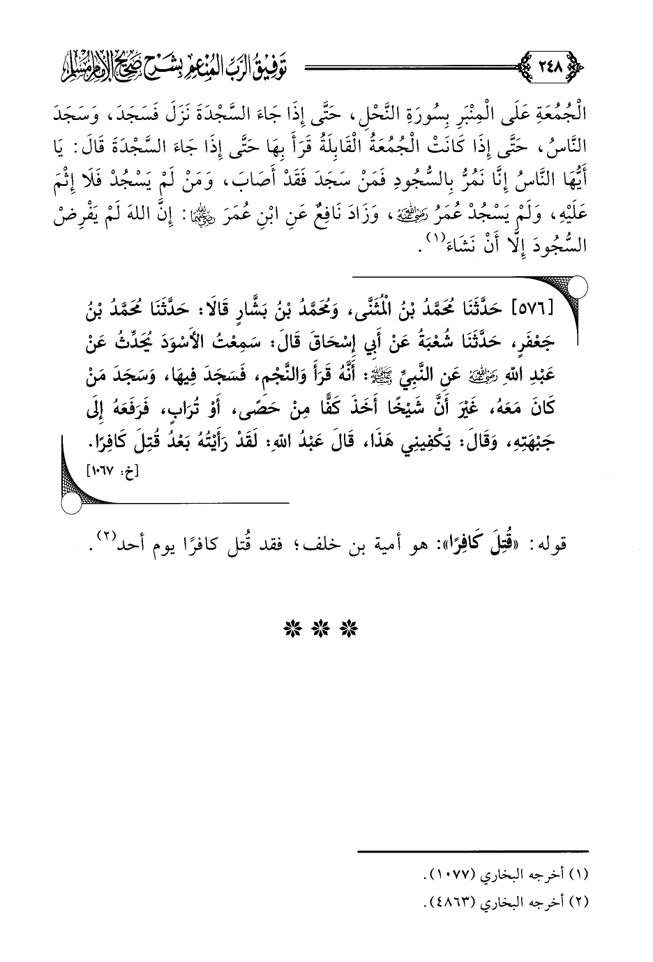 [٥٧٦] حَدَّثَنَا مُحَمَّدُ بْنُ الْمُثَنَّى، وَمُحَمَّدُ بْنُ بَشَّارٍ قَالَا: حَدَّثَنَا مُحَمَّدُ بْنُ جَعْفَرٍ، حَدَّثَنَا شُعْبَةُ عَنْ أَبِي إِسْحَاقَ قَالَ: سَمِعْتُ الأَسْوَدَ يُحَدِّثُ عَنْ عَبْدِ اللَّهِ رضي الله عنه عَنِ النَّبِيِّ صلى الله عليه وسلم: أَنَّهُ قَرَأَ وَالنَّجْمِ، فَسَجَدَ فِيهَا، وَسَجَدَ مَنْ كَانَ مَعَهُ، غَيْرَ أَنَّ شَيْخًا أَخَذَ كَفًّا مِنْ حَصًى، أَوْ تُرَابٍ، فَرَفَعَهُ إِلَى جَبْهَتِهِ، وَقَالَ: يَكْفِينِي هَذَا، قَالَ عَبْدُ اللَّهِ: لَقَدْ رَأَيْتُهُ بَعْدُ قُتِلَ كَافِرًا.
