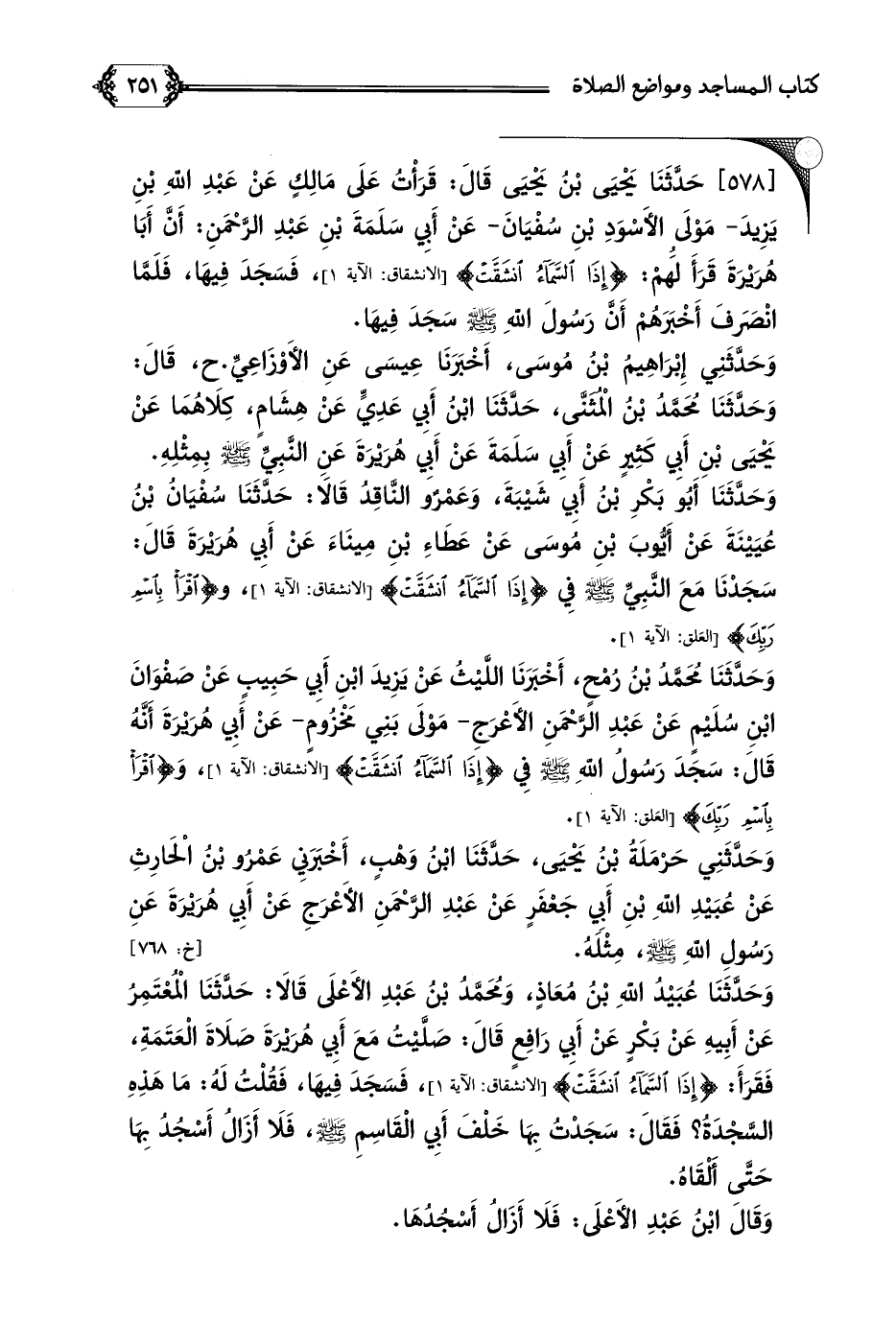 [٥٧٨] حَدَّثَنَا يَحْيَى بْنُ يَحْيَى قَالَ: قَرَأْتُ عَلَى مَالِكٍ عَنْ عَبْدِ اللَّهِ بْنِ يَزِيدَ- مَوْلَى الأَسْوَدِ بْنِ سُفْيَانَ- عَنْ أَبِي سَلَمَةَ بْنِ عَبْدِ الرَّحْمَنِ: أَنَّ أَبَا هُرَيْرَةَ قَرَأَ لَهُمْ: {إِذَا السَّمَاءُ انْشَقَّتْ}، فَسَجَدَ فِيهَا، فَلَمَّا انْصَرَفَ أَخْبَرَهُمْ أَنَّ رَسُولَ اللَّهِ صلى الله عليه وسلم سَجَدَ فِيهَا.