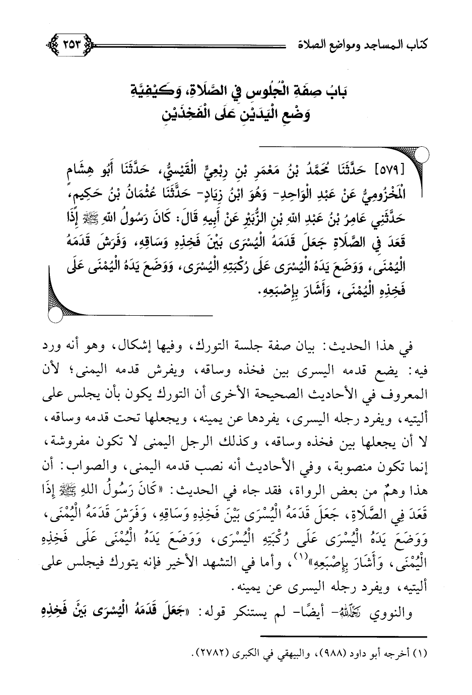 [٥٧٩] حَدَّثَنَا مُحَمَّدُ بْنُ مَعْمَرِ بْنِ رِبْعِيٍّ الْقَيْسِيُّ، حَدَّثَنَا أَبُو هِشَامٍ الْمَخْزُومِيُّ عَنْ عَبْدِ الْوَاحِدِ- وَهُوَ ابْنُ زِيَادٍ- حَدَّثَنَا عُثْمَانُ ابْنُ حَكِيمٍ، حَدَّثَنِي عَامِرُ بْنُ عَبْدِ اللَّهِ بْنِ الزُّبَيْرِ عَنْ أَبِيهِ قَالَ: كَانَ رَسُولُ اللَّهِ صلى الله عليه وسلم إِذَا قَعَدَ فِي الصَّلَاةِ جَعَلَ قَدَمَهُ الْيُسْرَى بَيْنَ فَخِذِهِ وَسَاقِهِ، وَفَرَشَ قَدَمَهُ الْيُمْنَى، وَوَضَعَ يَدَهُ الْيُسْرَى عَلَى رُكْبَتِهِ الْيُسْرَى، وَوَضَعَ يَدَهُ الْيُمْنَى عَلَى فَخِذِهِ الْيُمْنَى، وَأَشَارَ بِإِصْبَعِهِ.