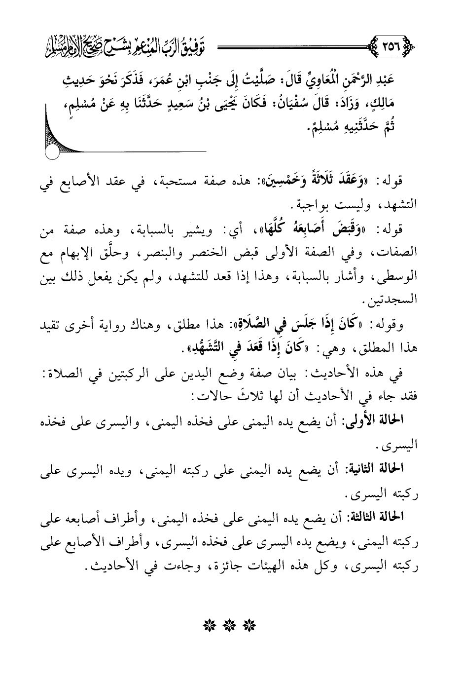 قوله: ((وَعَقَدَ ثَلَاثَةً وَخَمْسِينَ)) هذه صفة مستحبة، في عقد الأصابع في التشهد، وليست بواجبة.