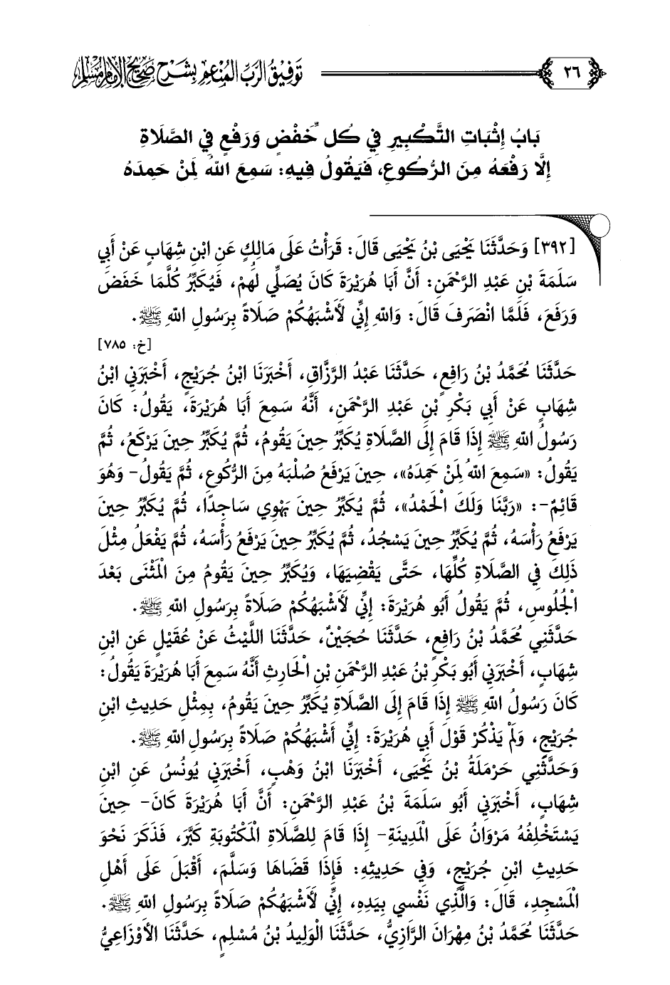 [٣٩٢] وَحَدَّثَنَا يَحْيَى بْنُ يَحْيَى قَالَ: قَرَأْتُ عَلَى مَالِكٍ عَنِ ابْنِ شِهَابٍ عَنْ أَبِي سَلَمَةَ بْنِ عَبْدِ الرَّحْمَنِ: أَنَّ أَبَا هُرَيْرَةَ كَانَ يُصَلِّي لَهُمْ، فَيُكَبِّرُ كُلَّمَا خَفَضَ وَرَفَعَ، فَلَمَّا انْصَرَفَ قَالَ: وَاللَّهِ إِنِّي لَأَشْبَهُكُمْ صَلَاةً بِرَسُولِ اللَّهِ صلى الله عليه وسلم.
