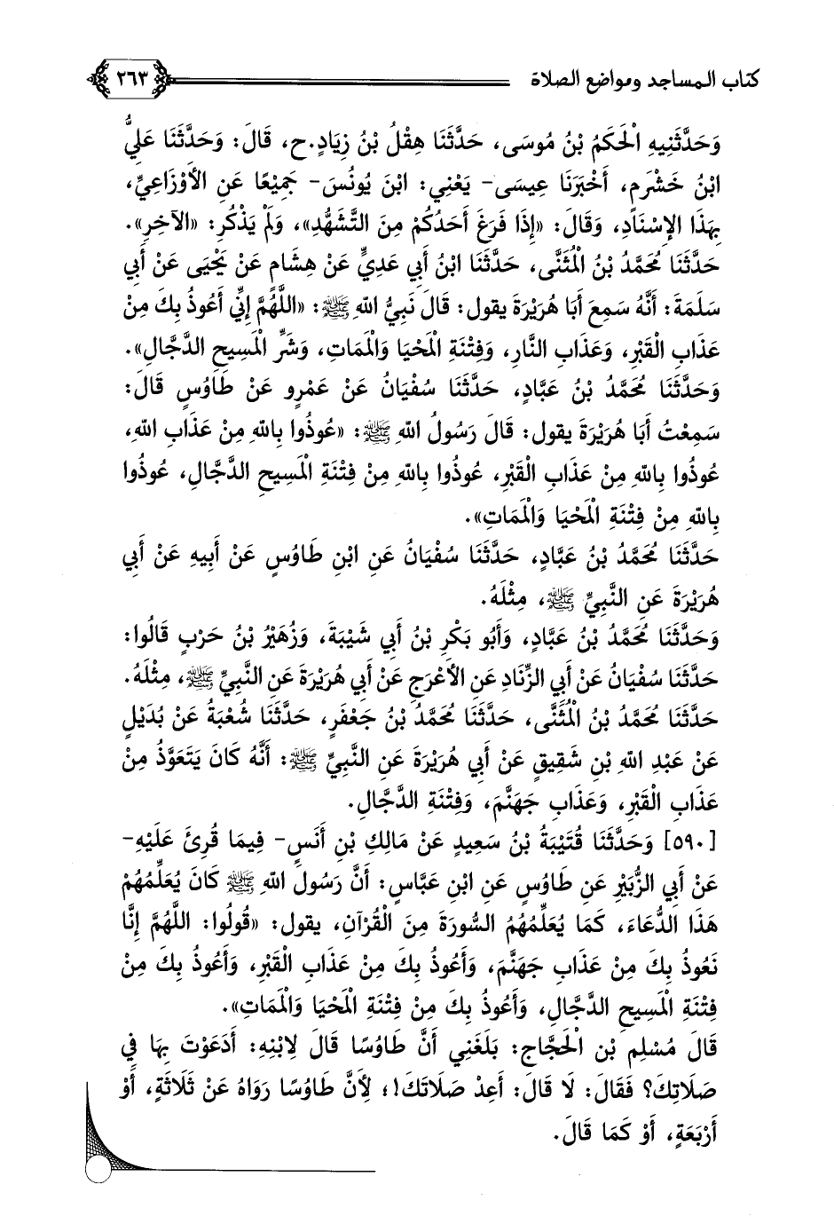 [٥٩٠] وَحَدَّثَنَا قُتَيْبَةُ بْنُ سَعِيدٍ عَنْ مَالِكِ بْنِ أَنَسٍ- فِيمَا قُرِئَ عَلَيْهِ- عَنْ أَبِي الزُّبَيْرِ عَنِ طَاوُسٍ عَنِ ابْنِ عَبَّاسٍ: أَنَّ رَسُولَ اللَّهِ صلى الله عليه وسلم كَانَ يُعَلِّمُهُمْ هَذَا الدُّعَاءَ، كَمَا يُعَلِّمُهُمُ السُّورَةَ مِنَ الْقُرْآنِ، يقول: ((قُولُوا: اللَّهُمَّ إِنَّا نَعُوذُ بِكَ مِنْ عَذَابِ جَهَنَّمَ، وَأَعُوذُ بِكَ مِنْ عَذَابِ الْقَبْرِ، وَأَعُوذُ بِكَ مِنْ فِتْنَةِ الْمَسِيحِ الدَّجَّالِ، وَأَعُوذُ بِكَ مِنْ فِتْنَةِ الْمَحْيَا وَالْمَمَاتِ)).