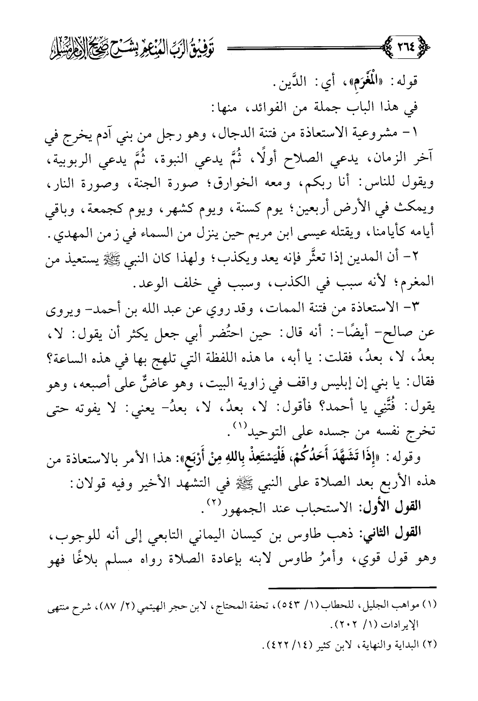 وقوله: ((إِذَا تَشَهَّدَ أَحَدُكُمْ، فَلْيَسْتَعِذْ بِاللَّهِ مِنْ أَرْبَعٍ)) هذا الأمر بالاستعاذة من هذه الأربع بعد الصلاة على النبي صلى الله عليه وسلم في التشهد الأخير وفيه قولان.