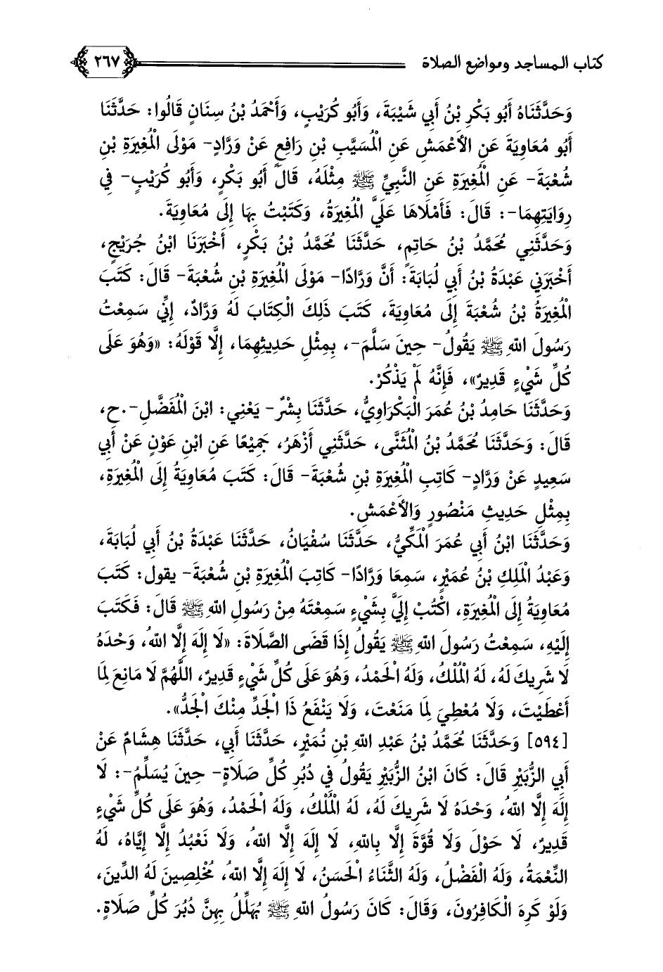 [٥٩٤] وَحَدَّثَنَا مُحَمَّدُ بْنُ عَبْدِ اللَّهِ بْنِ نُمَيْرٍ، حَدَّثَنَا أَبِي، حَدَّثَنَا هِشَامٌ عَنْ أَبِي الزُّبَيْرِ قَالَ: كَانَ ابْنُ الزُّبَيْرِ يَقُولُ فِي دُبُرِ كُلِّ صَلَاةٍ- حِينَ يُسَلِّمُ-: لَا إِلَهَ إِلَّا اللَّهُ، وَحْدَهُ لَا شَرِيكَ لَهُ، لَهُ الْمُلْكُ، وَلَهُ الْحَمْدُ، وَهُوَ عَلَى كُلِّ شَيْءٍ قَدِيرٌ، لَا حَوْلَ وَلَا قُوَّةَ إِلَّا بِاللَّهِ، لَا إِلَهَ إِلَّا اللَّهُ، وَلَا نَعْبُدُ إِلَّا إِيَّاهُ، لَهُ النِّعْمَةُ، وَلَهُ الْفَضْلُ، وَلَهُ الثَّنَاءُ الْحَسَنُ، لَا إِلَهَ إِلَّا اللَّهُ، مُخْلِصِينَ لَهُ الدِّينَ، وَلَوْ كَرِهَ الْكَافِرُونَ، وَقَالَ: كَانَ رَسُولُ اللَّهِ صلى الله عليه وسلم يُهَلِّلُ بِهِنَّ دُبُرَ كُلِّ صَلَاةٍ.