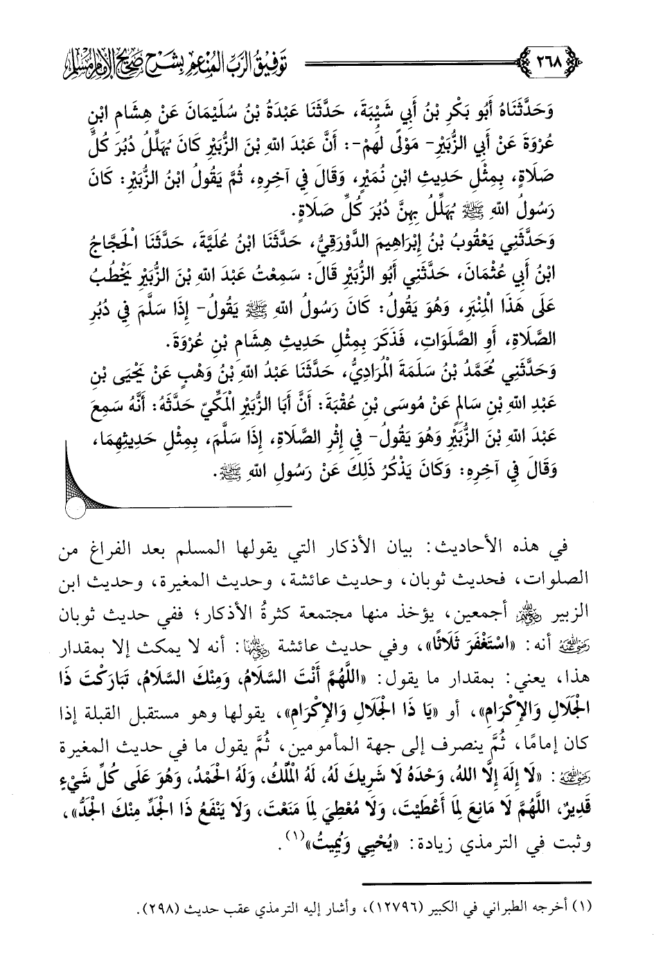 في هذه الأحاديث: بيان الأذكار التي يقولها المسلم بعد الفراغ من الصلوات، فحديث ثوبان، وحديث عائشة، وحديث المغيرة، وحديث ابن الزبير رضي الله عنهم أجمعين، يؤخذ منها مجتمعة كثرةُ الأذكار؛ ففي حديث ثوبان رضي الله عنه أنه: ((اسْتَغْفَرَ ثَلَاثًا))، وفي حديث عائشة رضي الله عنها: أنه لا يمكث إلا بمقدار هذا، يعني: بمقدار ما يقول: ((اللَّهُمَّ أَنْتَ السَّلَامُ، وَمِنْكَ السَّلَامُ، تَبَارَكْتَ ذَا الْجَلَالِ وَالإِكْرَامِ))، أو ((يَا ذَا الْجَلَالِ وَالإِكْرَامِ))، يقولها وهو مستقبل القبلة إذا كان إمامًا، ثُمَّ ينصرف إلى جهة المأمومين، ثُمَّ يقول ما في حديث المغيرة رضي الله عنه: ((لَا إِلَهَ إِلَّا اللَّهُ، وَحْدَهُ لَا شَرِيكَ لَهُ، لَهُ الْمُلْكُ، وَلَهُ الْحَمْدُ، وَهُوَ عَلَى كُلِّ شَيْءٍ قَدِيرٌ، اللَّهُمَّ لَا مَانِعَ لِمَا أَعْطَيْتَ، وَلَا مُعْطِيَ لِمَا مَنَعْتَ، وَلَا يَنْفَعُ ذَا الْجَدِّ مِنْكَ الْجَدُّ))، وثبت في الترمذي زيادة: ((يُحْيِي وَيُمِيتُ)) (¬١).