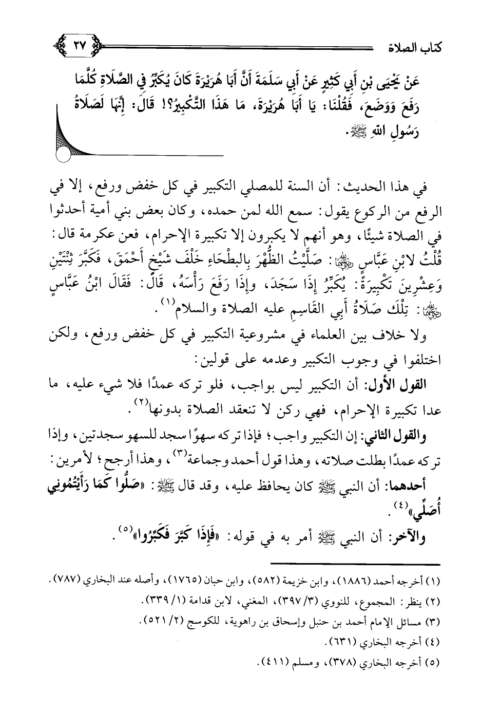 عَنْ يَحْيَى بْنِ أَبِي كَثِيرٍ عَنْ أَبِي سَلَمَةَ أَنَّ أَبَا هُرَيْرَةَ كَانَ يُكَبِّرُ فِي الصَّلَاةِ كُلَّمَا رَفَعَ وَوَضَعَ، فَقُلْنَا: يَا أَبَا هُرَيْرَةَ، مَا هَذَا التَّكْبِيرُ؟ ! قَالَ: إِنَّهَا لَصَلَاةُ رَسُولِ اللَّهِ صلى الله عليه وسلم.