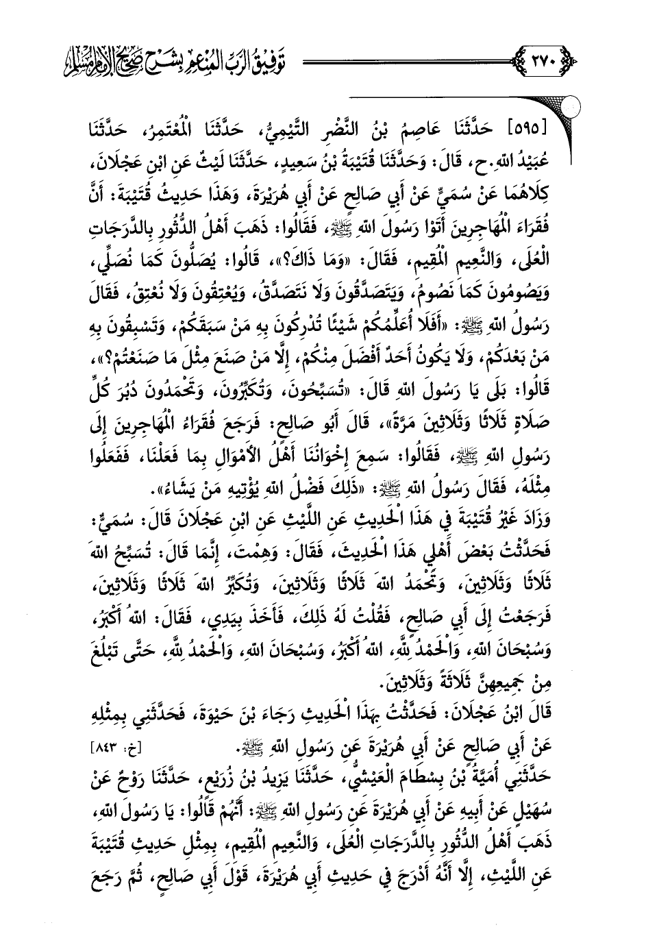 [٥٩٥] حَدَّثَنَا عَاصِمُ بْنُ النَّضْرِ التَّيْمِيُّ، حَدَّثَنَا الْمُعْتَمِرُ، حَدَّثَنَا عُبَيْدُ اللَّهِ. ح، قَالَ: وَحَدَّثَنَا قُتَيْبَةُ بْنُ سَعِيدٍ، حَدَّثَنَا لَيْثٌ عَنِ ابْنِ عَجْلَانَ، كِلَاهُمَا عَنْ سُمَيٍّ عَنْ أَبِي صَالِحٍ عَنْ أَبِي هُرَيْرَةَ، وَهَذَا حَدِيثُ قُتَيْبَةَ: أَنَّ فُقَرَاءَ الْمُهَاجِرِينَ أَتَوْا رَسُولَ اللَّهِ صلى الله عليه وسلم، فَقَالُوا: ذَهَبَ أَهْلُ الدُّثُورِ بِالدَّرَجَاتِ الْعُلَى، وَالنَّعِيمِ الْمُقِيمِ، فَقَالَ: ((وَمَا ذَاكَ؟ ))، قَالُوا: يُصَلُّونَ كَمَا نُصَلِّي، وَيَصُومُونَ كَمَا نَصُومُ، وَيَتَصَدَّقُونَ وَلَا نَتَصَدَّقُ، وَيُعْتِقُونَ وَلَا نُعْتِقُ، فَقَالَ رَسُولُ اللَّهِ صلى الله عليه وسلم: ((أَفَلَا أُعَلِّمُكُمْ شَيْئًا تُدْرِكُونَ بِهِ مَنْ سَبَقَكُمْ، وَتَسْبِقُونَ بِهِ مَنْ بَعْدَكُمْ، وَلَا يَكُونُ أَحَدٌ أَفْضَلَ مِنْكُمْ، إِلَّا مَنْ صَنَعَ مِثْلَ مَا صَنَعْتُمْ؟ ))، قَالُوا: بَلَى يَا رَسُولَ اللَّهِ قَالَ: ((تُسَبِّحُونَ، وَتُكَبِّرُونَ، وَتَحْمَدُونَ دُبُرَ كُلِّ صَلَاةٍ ثَلَاثًا وَثَلَاثِينَ مَرَّةً))، قَالَ أَبُو صَالِحٍ: فَرَجَعَ فُقَرَاءُ الْمُهَاجِرِينَ إِلَى رَسُولِ اللَّهِ صلى الله عليه وسلم، فَقَالُوا: سَمِعَ إِخْوَانُنَا أَهْلُ الأَمْوَالِ بِمَا فَعَلْنَا، فَفَعَلُوا مِثْلَهُ، فَقَالَ رَسُولُ اللَّهِ صلى الله عليه وسلم: ((ذَلِكَ فَضْلُ اللَّهِ يُؤْتِيهِ مَنْ يَشَاءُ)).