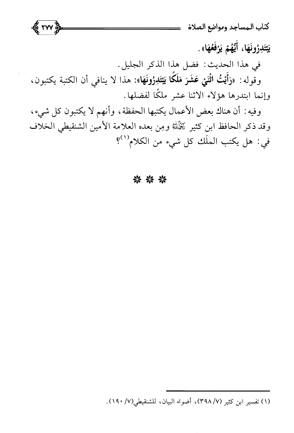 وفيه: أن هناك بعض الأعمال يكتبها الحفظة، وأنهم لا يكتبون كل شيء، وقد ذكر الحافظ ابن كثير رحمه الله ومِن بعده العلامة الأمين الشنقيطي الخلاف في: هل يكتب الملَك كل شيء من الكلام؟ (¬١)