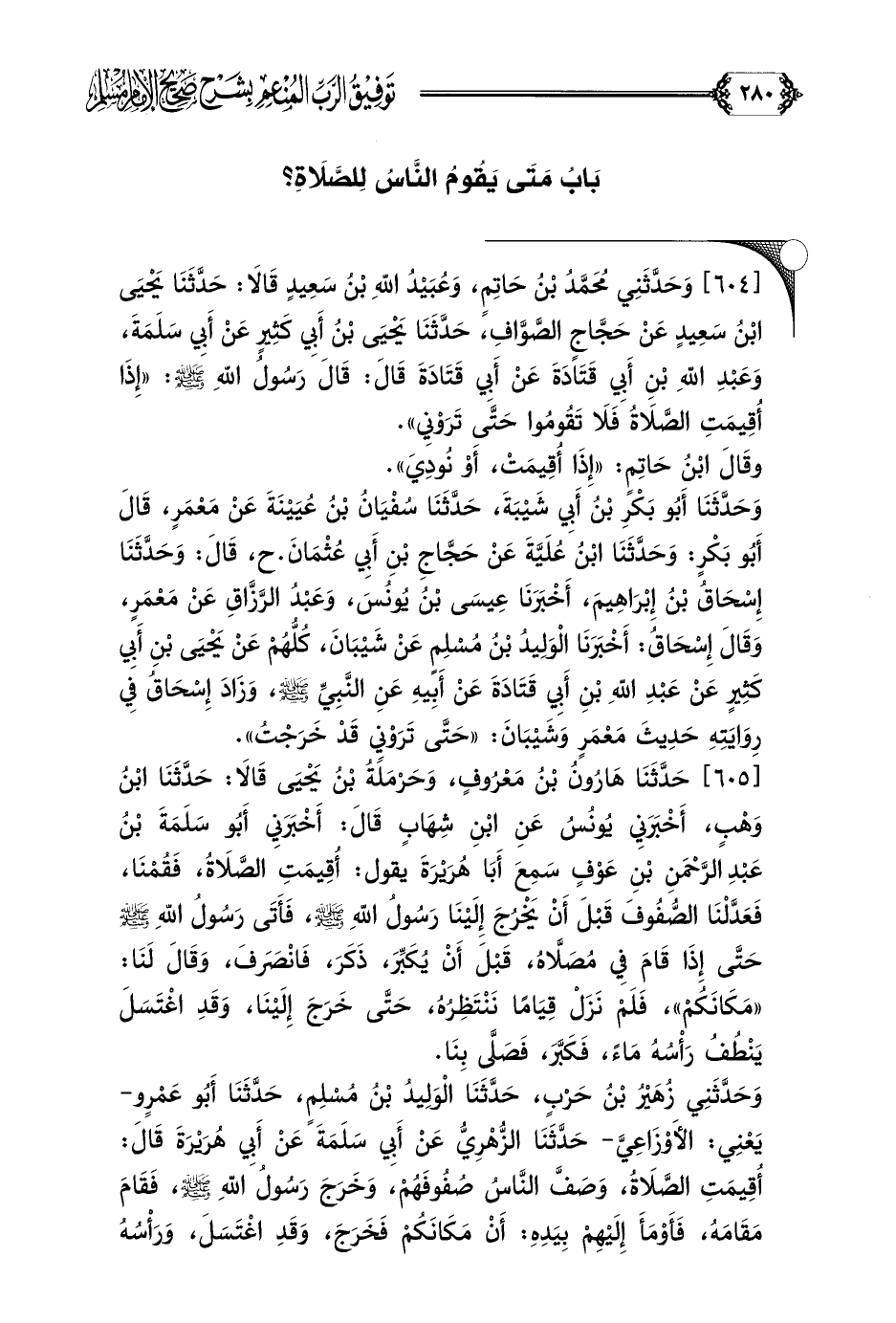 [٦٠٥] حَدَّثَنَا هَارُونُ بْنُ مَعْرُوفٍ، وَحَرْمَلَةُ بْنُ يَحْيَى قَالَا: حَدَّثَنَا ابْنُ وَهْبٍ، أَخْبَرَنِي يُونُسُ عَنِ ابْنِ شِهَابٍ قَالَ: أَخْبَرَنِي أَبُو سَلَمَةَ بْنُ عَبْدِ الرَّحْمَنِ بْنِ عَوْفٍ سَمِعَ أَبَا هُرَيْرَةَ يقول: أُقِيمَتِ الصَّلَاةُ، فَقُمْنَا، فَعَدَّلْنَا الصُّفُوفَ قَبْلَ أَنْ يَخْرُجَ إِلَيْنَا رَسُولُ اللَّهِ صلى الله عليه وسلم، فَأَتَى رَسُولُ اللَّهِ صلى الله عليه وسلم حَتَّى إِذَا قَامَ فِي مُصَلَّاهُ، قَبْلَ أَنْ يُكَبِّرَ، ذَكَرَ، فَانْصَرَفَ، وَقَالَ لَنَا: ((مَكَانَكُمْ))، فَلَمْ نَزَلْ قِيَامًا نَنْتَظِرُهُ، حَتَّى خَرَجَ إِلَيْنَا، وَقَدِ اغْتَسَلَ يَنْطُفُ رَأْسُهُ مَاءً، فَكَبَّرَ، فَصَلَّى بِنَا.