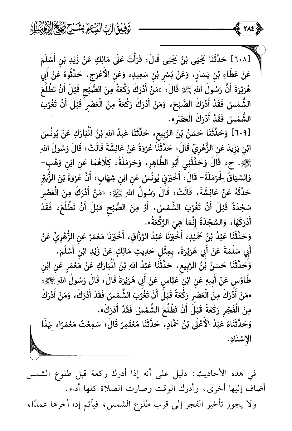 [٦٠٨] حَدَّثَنَا يَحْيَى بْنُ يَحْيَى قَالَ: قَرَأْتُ عَلَى مَالِكٍ عَنْ زَيْدِ بْنِ أَسْلَمَ عَنْ عَطَاءِ بْنِ يَسَارٍ، وَعَنْ بُسْرِ بْنِ سَعِيدٍ، وَعَنِ الأَعْرَجِ، حَدَّثُوهُ عَنْ أَبِي هُرَيْرَةَ أَنَّ رَسُولَ اللَّهِ صلى الله عليه وسلم قَالَ: ((مَنْ أَدْرَكَ رَكْعَةً مِنَ الصُّبْحِ قَبْلَ أَنْ تَطْلُعَ الشَّمْسُ فَقَدْ أَدْرَكَ الصُّبْحَ، وَمَنْ أَدْرَكَ رَكْعَةً مِنَ الْعَصْرِ قَبْلَ أَنْ تَغْرُبَ الشَّمْسُ فَقَدْ أَدْرَكَ الْعَصْرَ)).