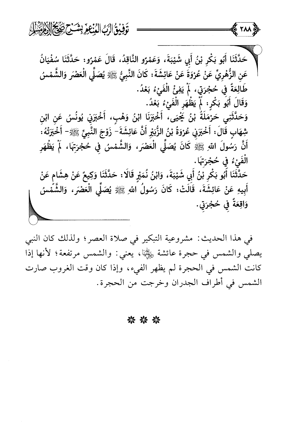 حَدَّثَنَا أَبُو بَكْرِ بْنُ أَبِي شَيْبَةَ، وَعَمْرٌو النَّاقِدُ، قَالَ عَمْرٌو: حَدَّثَنَا سُفْيَانُ عَنِ الزُّهْرِيِّ عَنْ عُرْوَةَ عَنْ عَائِشَةَ: كَانَ النَّبِيُّ صلى الله عليه وسلم يُصَلِّي الْعَصْرَ وَالشَّمْسُ طَالِعَةٌ فِي حُجْرَتِي، لَمْ يَفِئْ الْفَيْءُ بَعْدُ.