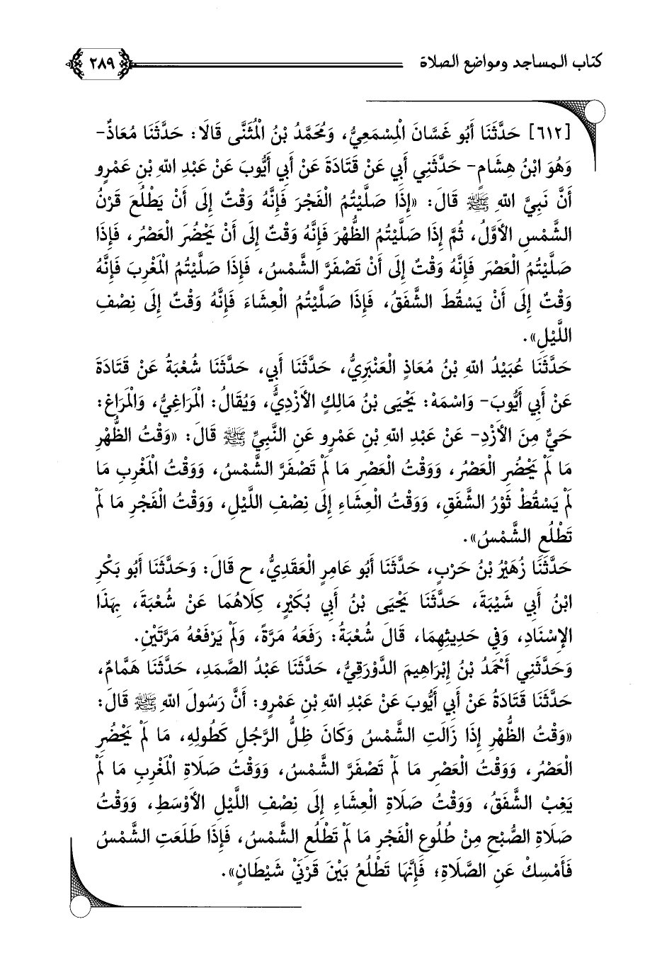[٦١٢] حَدَّثَنَا أَبُو غَسَّانَ الْمِسْمَعِيُّ، وَمُحَمَّدُ بْنُ الْمُثَنَّى قَالَا: حَدَّثَنَا مُعَاذٌ- وَهُوَ ابْنُ هِشَامٍ- حَدَّثَنِي أَبِي عَنْ قَتَادَةَ عَنْ أَبِي أَيُّوبَ عَنْ عَبْدِ اللَّهِ بْنِ عَمْرٍو أَنَّ نَبِيَّ اللَّهِ صلى الله عليه وسلم قَالَ: ((إِذَا صَلَّيْتُمُ الْفَجْرَ فَإِنَّهُ وَقْتٌ إِلَى أَنْ يَطْلُعَ قَرْنُ الشَّمْسِ الأَوَّلُ، ثُمَّ إِذَا صَلَّيْتُمُ الظُّهْرَ فَإِنَّهُ وَقْتٌ إِلَى أَنْ يَحْضُرَ الْعَصْرُ، فَإِذَا صَلَّيْتُمُ الْعَصْرَ فَإِنَّهُ وَقْتٌ إِلَى أَنْ تَصْفَرَّ الشَّمْسُ، فَإِذَا صَلَّيْتُمُ الْمَغْرِبَ فَإِنَّهُ وَقْتٌ إِلَى أَنْ يَسْقُطَ الشَّفَقُ، فَإِذَا صَلَّيْتُمُ الْعِشَاءَ فَإِنَّهُ وَقْتٌ إِلَى نِصْفِ اللَّيْلِ)).