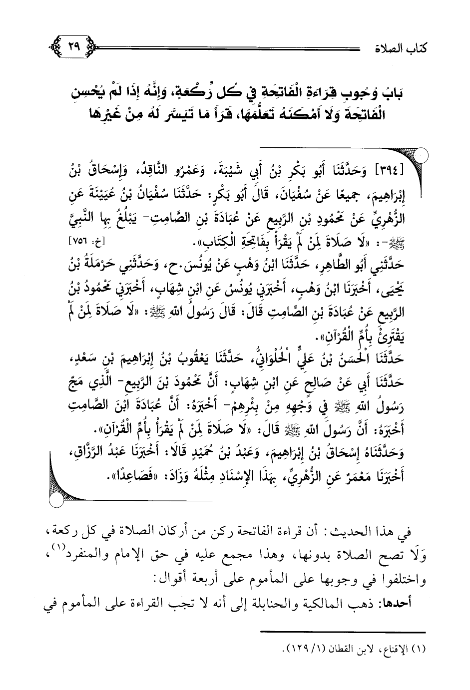 [٣٩٤] وَحَدَّثَنَا أَبُو بَكْرِ بْنُ أَبِي شَيْبَةَ، وَعَمْرٌو النَّاقِدُ، وَإِسْحَاقُ بْنُ إِبْرَاهِيمَ، جميعًا عَنْ سُفْيَانَ، قَالَ أَبُو بَكْرٍ: حَدَّثَنَا سُفْيَانُ بْنُ عُيَيْنَةَ عَنِ الزُّهْرِيِّ عَنْ مَحْمُودِ بْنِ الرَّبِيعِ عَنْ عُبَادَةَ بْنِ الصَّامِتِ- يَبْلُغُ بِهِا النَّبِيَّ صلى الله عليه وسلم-: ((لَا صَلَاةَ لِمَنْ لَمْ يَقْرَأْ بِفَاتِحَةِ الْكِتَابِ)).