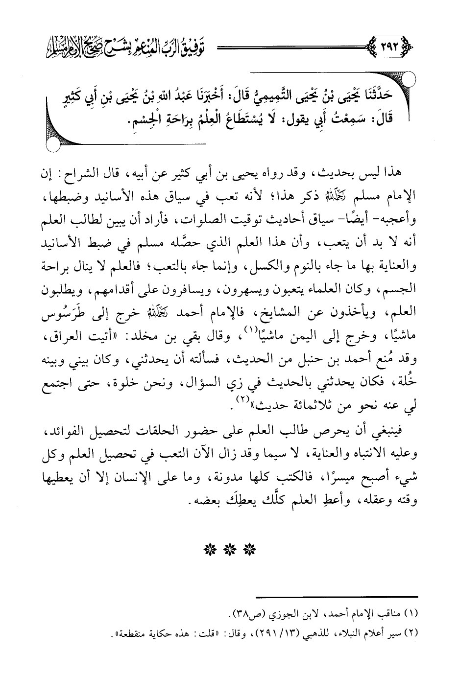 هذا ليس بحديث، وقد رواه يحيى بن أبي كثير عن أبيه، قال الشراح: إن الإمام مسلم رحمه الله ذكر هذا؛ لأنه تعب في سياق هذه الأسانيد وضبطها، وأعجبه- أيضًا- سياق أحاديث توقيت الصلوات، فأراد أن يبين لطالب العلم أنه لا بد أن يتعب، وأن هذا العلم الذي حصَّله مسلم في ضبط الأسانيد والعناية بها ما جاء بالنوم والكسل، وإنما جاء بالتعب؛ فالعلم لا ينال براحة الجسم، وكان العلماء يتعبون ويسهرون، ويسافرون على أقدامهم، ويطلبون العلم، ويأخذون عن المشايخ، فالإمام أحمد رحمه الله خرج إلى طَرَسُوس ماشيًا، وخرج إلى اليمن ماشيًا (¬١)، وقال بقي بن مخلد: ((أتيت العراق، وقد مُنع أحمد بن حنبل من الحديث، فسألته أن يحدثني، وكان بيني وبينه خُلة، فكان يحدثني بالحديث في زي السؤال، ونحن خلوة، حتى اجتمع لي عنه نحو من ثلاثمائة حديث)) (¬٢).