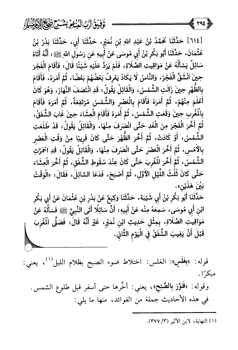 [٦١٤] حَدَّثَنَا مُحَمَّدُ بْنُ عَبْدِ اللَّهِ بْنِ نُمَيْرٍ، حَدَّثَنَا أَبِي، حَدَّثَنَا بَدْرُ بْنُ عُثْمَانَ، حَدَّثَنَا أَبُو بَكْرِ بْنُ أَبِي مُوسَى عَنْ أَبِيهِ عَنِ رَسُولِ اللَّهِ صلى الله عليه وسلم: أَنَّهُ أَتَاهُ سَائِلٌ يَسْأَلُهُ عَنْ مَوَاقِيتِ الصَّلَاةِ، فَلَمْ يَرُدَّ عَلَيْهِ شَيْئًا قَالَ: فَأَقَامَ الْفَجْرَ حِينَ انْشَقَّ الْفَجْرُ، وَالنَّاسُ لَا يَكَادُ يَعْرِفُ بَعْضُهُمْ بَعْضًا، ثُمَّ أَمَرَهُ، فَأَقَامَ بِالظُّهْرِ حِينَ زَالَتِ الشَّمْسُ، وَالْقَائِلُ يَقُولُ: قَدِ انْتَصَفَ النَّهَارُ، وَهُوَ كَانَ أَعْلَمَ مِنْهُمْ، ثُمَّ أَمَرَهُ فَأَقَامَ بِالْعَصْرِ وَالشَّمْسُ مُرْتَفِعَةٌ، ثُمَّ أَمَرَهُ فَأَقَامَ بِالْمَغْرِبِ حِينَ وَقَعَتِ الشَّمْسُ، ثُمَّ أَمَرَهُ فَأَقَامَ الْعِشَاءَ حِينَ غَابَ الشَّفَقُ، ثُمَّ أَخَّرَ الْفَجْرَ مِنَ الْغَدِ حَتَّى انْصَرَفَ مِنْهَا، وَالْقَائِلُ يَقُولُ: قَدْ طَلَعَتِ الشَّمْسُ، أَوْ كَادَتْ، ثُمَّ أَخَّرَ الظُّهْرَ حَتَّى كَانَ قَرِيبًا مِنْ وَقْتِ الْعَصْرِ بِالأَمْسِ، ثُمَّ أَخَّرَ الْعَصْرَ حَتَّى انْصَرَفَ مِنْهَا، وَالْقَائِلُ يَقُولُ: قَدِ احْمَرَّتِ الشَّمْسُ، ثُمَّ أَخَّرَ الْمَغْرِبَ حَتَّى كَانَ عِنْدَ سُقُوطِ الشَّفَقِ، ثُمَّ أَخَّرَ الْعِشَاءَ حَتَّى كَانَ ثُلُثُ اللَّيْلِ الأَوَّلِ، ثُمَّ أَصْبَحَ، فَدَعَا السَّائِلَ، فَقَالَ: ((الْوَقْتُ بَيْنَ هَذَيْنِ)).