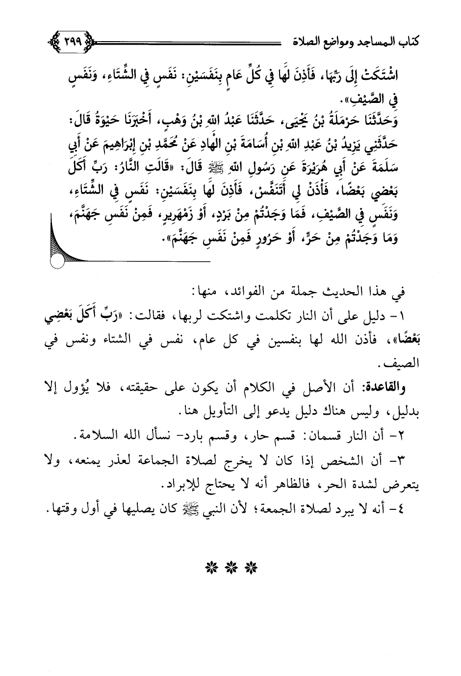 ١. دليل على أن النار تكلمت واشتكت لربها، فقالت: ((رَبِّ أَكَلَ بَعْضِي بَعْضًا))، فأذن الله لها بنفسين في كل عام، نفس في الشتاء ونفس في الصيف.