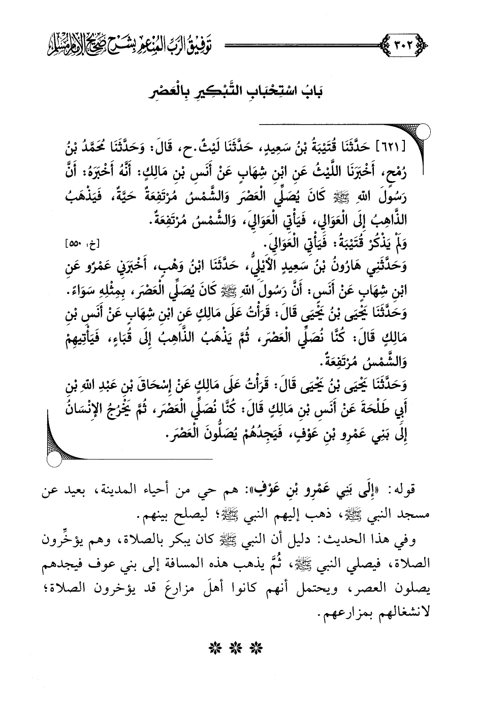 وفي هذا الحديث: دليل أن النبي صلى الله عليه وسلم كان يبكر بالصلاة، وهم يؤخِّرون الصلاة، فيصلي النبي صلى الله عليه وسلم، ثُمَّ يذهب هذه المسافة إلى بني عوف فيجدهم يصلون العصر، ويحتمل أنهم كانوا أهلَ مزارعَ قد يؤخرون الصلاة؛ لانشغالهم بمزارعهم.