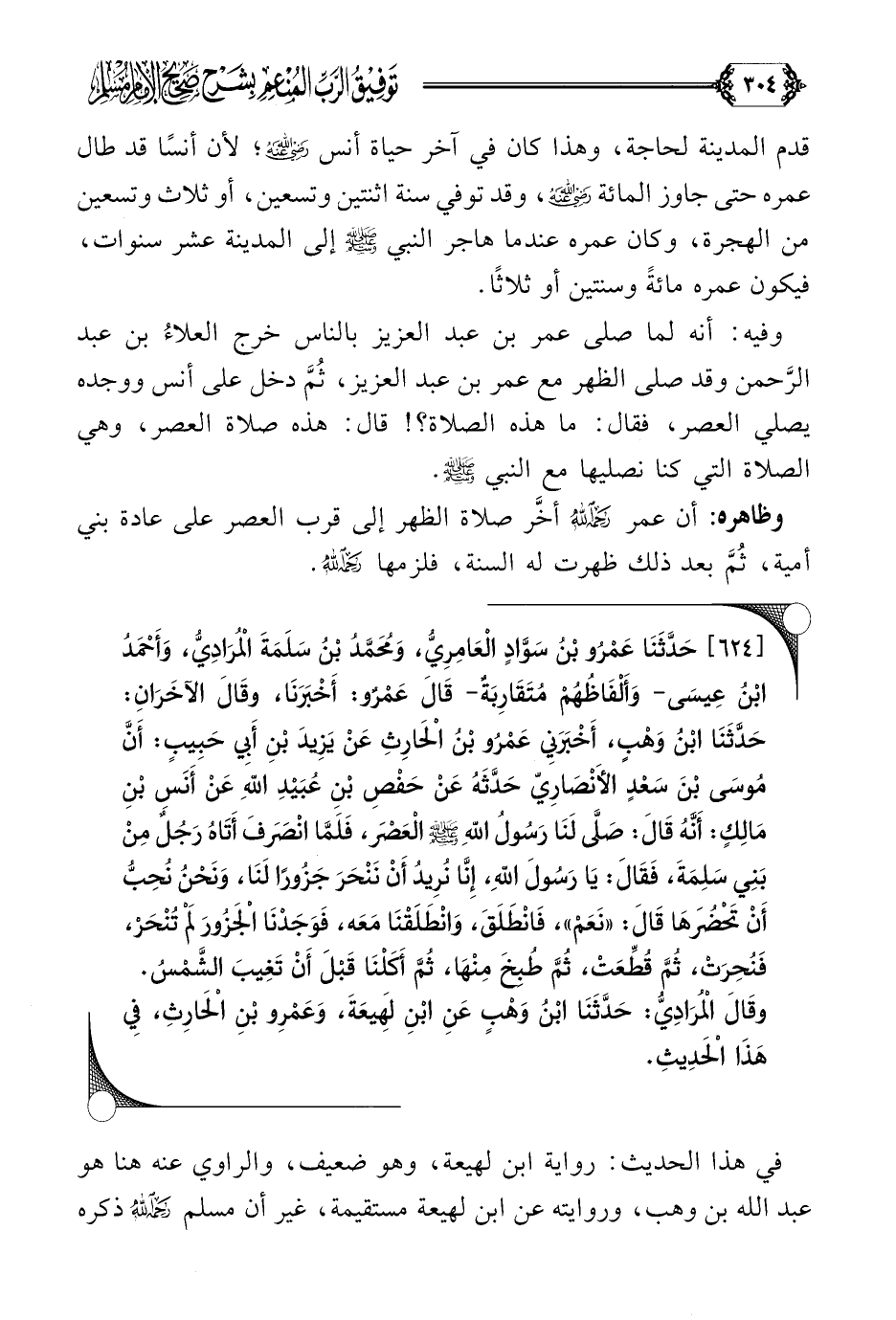 [٦٢٤] حَدَّثَنَا عَمْرُو بْنُ سَوَّادٍ الْعَامِرِيُّ، وَمُحَمَّدُ بْنُ سَلَمَةَ الْمُرَادِيُّ، وَأَحْمَدُ بْنُ عِيسَى- وَأَلْفَاظُهُمْ مُتَقَارِبَةٌ- قَالَ عَمْرٌو: أَخْبَرَنَا، وقَالَ الآخَرَانِ: حَدَّثَنَا ابْنُ وَهْبٍ، أَخْبَرَنِي عَمْرُو بْنُ الْحَارِثِ عَنْ يَزِيدَ بْنِ أَبِي حَبِيبٍ: أَنَّ مُوسَى بْنَ سَعْدٍ الأَنْصَارِيّ حَدَّثَهُ عَنْ حَفْصِ بْنِ عُبَيْدِ اللَّهِ عَنْ أَنَسِ بْنِ مَالِكٍ: أَنَّهُ قَالَ: صَلَّى لَنَا رَسُولُ اللَّهِ صلى الله عليه وسلم الْعَصْرَ، فَلَمَّا انْصَرَفَ أَتَاهُ رَجُلٌ مِنْ بَنِي سَلِمَةَ، فَقَالَ: يَا رَسُولَ اللَّهِ، إِنَّا نُرِيدُ أَنْ نَنْحَرَ جَزُورًا لَنَا، وَنَحْنُ نُحِبُّ أَنْ تَحْضُرَهَا قَالَ: ((نَعَمْ))، فَانْطَلَقَ، وَانْطَلَقْنَا مَعَه، فَوَجَدْنَا الْجَزُورَ لَمْ تُنْحَرْ، فَنُحِرَتْ، ثُمَّ قُطِّعَتْ، ثُمَّ طُبِخَ مِنْهَا، ثُمَّ أَكَلْنَا قَبْلَ أَنْ تَغِيبَ الشَّمْسُ.
