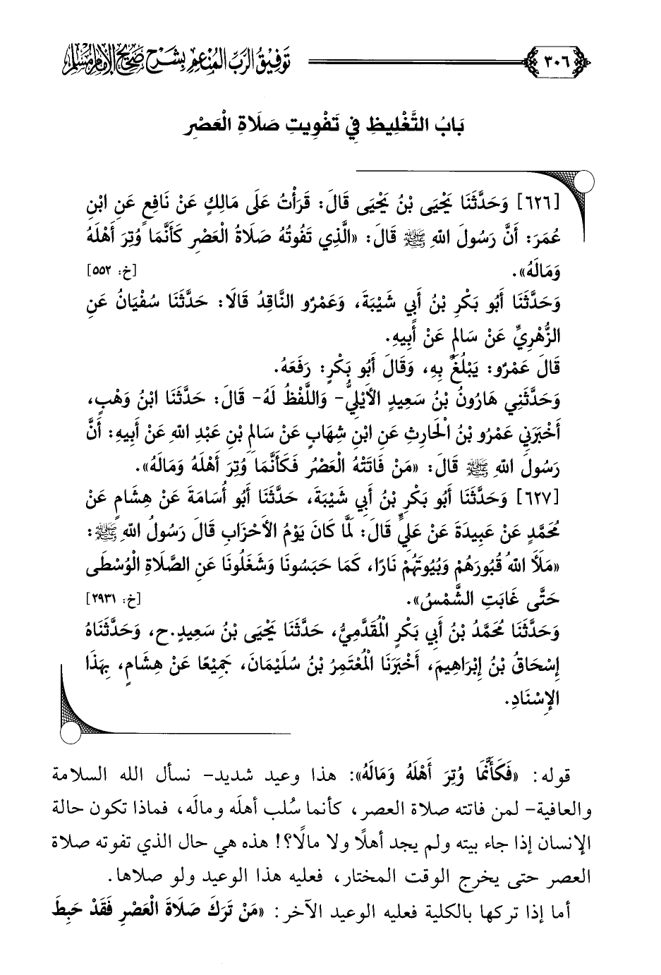 قوله: ((فَكَأَنَّمَا وُتِرَ أَهْلَهُ وَمَالَهُ)) هذا وعيد شديد- نسأل الله السلامة والعافية- لمن فاتته صلاة العصر، كأنما سُلب أهلَه ومالَه، فماذا تكون حالة الإنسان إذا جاء بيته ولم يجد أهلًا ولا مالًا؟ ! هذه هي حال الذي تفوته صلاة العصر حتى يخرج الوقت المختار، فعليه هذا الوعيد ولو صلاها.