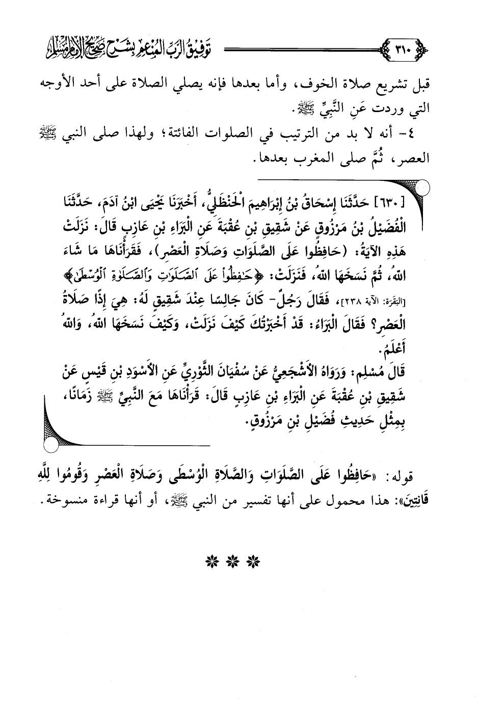 [٦٣٠] حَدَّثَنَا إِسْحَاقُ بْنُ إِبْرَاهِيمَ الْحَنْظَلِيُّ، أَخْبَرَنَا يَحْيَى ابْنُ آدَمَ، حَدَّثَنَا الْفُضَيْلُ بْنُ مَرْزُوقٍ عَنْ شَقِيقِ بْنِ عُقْبَةَ عَنِ الْبَرَاءِ بْنِ عَازِبٍ قَالَ: نَزَلَتْ هَذِهِ الآيَةُ: (حَافِظُوا عَلَى الصَّلَوَاتِ وَصَلَاةِ الْعَصْرِ)، فَقَرَأْنَاهَا مَا شَاءَ اللَّهُ، ثُمَّ نَسَخَهَا اللَّهُ، فَنَزَلَتْ: {حَافِظُوا عَلَى الصَّلَوَاتِ وَالصَّلاةِ الْوُسْطَى}، فَقَالَ رَجُلٌ- كَانَ جَالِسًا عِنْدَ شَقِيقٍ لَهُ: هِيَ إِذًا صَلَاةُ الْعَصْرِ؟ فَقَالَ الْبَرَاءُ: قَدْ أَخْبَرْتُكَ كَيْفَ نَزَلَتْ، وَكَيْفَ نَسَخَهَا اللَّهُ، وَاللَّهُ أَعْلَمُ.