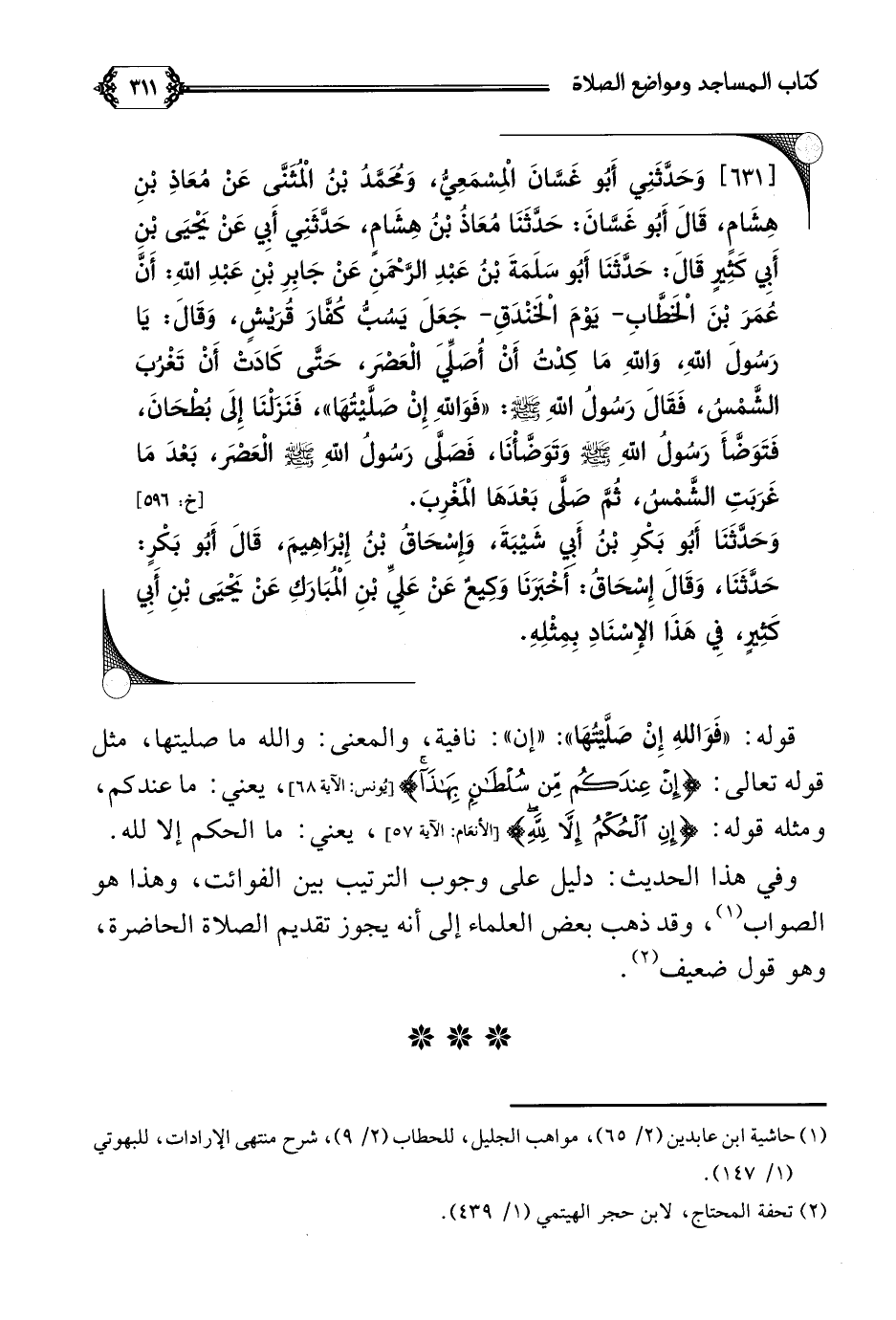 وفي هذا الحديث: دليل على وجوب الترتيب بين الفوائت، وهذا هو الصواب (¬١)، وقد ذهب بعض العلماء إلى أنه يجوز تقديم الصلاة الحاضرة، وهو قول ضعيف (¬٢).