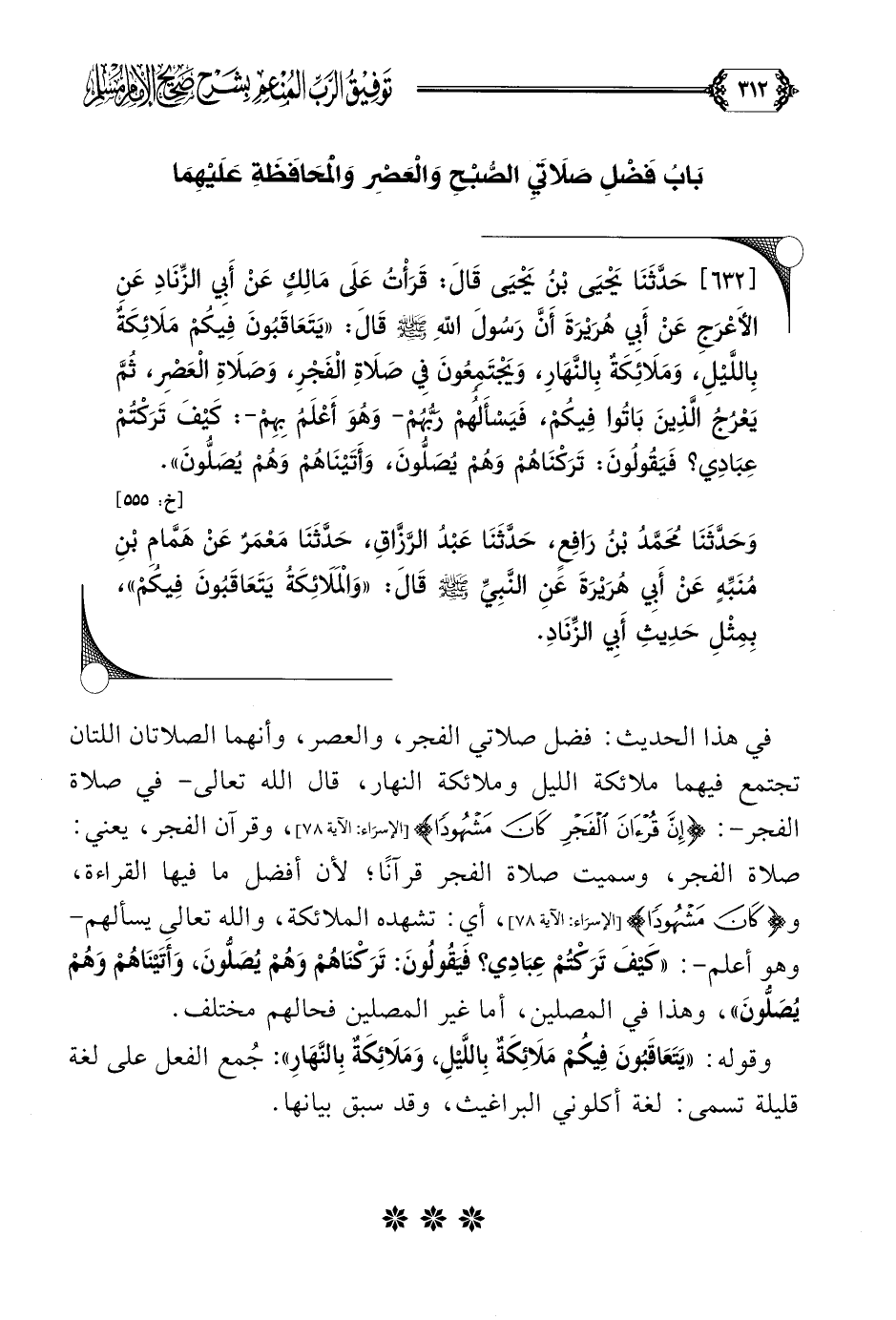 [٦٣٢] حَدَّثَنَا يَحْيَى بْنُ يَحْيَى قَالَ: قَرَأْتُ عَلَى مَالِكٍ عَنْ أَبِي الزِّنَادِ عَنِ الأَعْرَجِ عَنْ أَبِي هُرَيْرَةَ أَنَّ رَسُولَ اللَّهِ صلى الله عليه وسلم قَالَ: ((يَتَعَاقَبُونَ فِيكُمْ مَلَائِكَةٌ بِاللَّيْلِ، وَمَلَائِكَةٌ بِالنَّهَارِ، وَيَجْتَمِعُونَ فِي صَلَاةِ الْفَجْرِ، وَصَلَاةِ الْعَصْرِ، ثُمَّ يَعْرُجُ الَّذِينَ بَاتُوا فِيكُمْ، فَيَسْأَلُهُمْ رَبُّهُمْ- وَهُوَ أَعْلَمُ بِهِمْ-: كَيْفَ تَرَكْتُمْ عِبَادِي؟ فَيَقُولُونَ: تَرَكْنَاهُمْ وَهُمْ يُصَلُّونَ، وَأَتَيْنَاهُمْ وَهُمْ يُصَلُّونَ)).