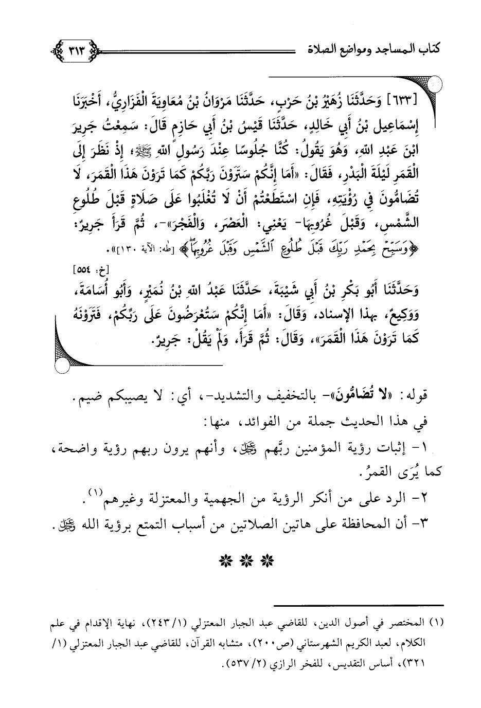 [٦٣٣] وَحَدَّثَنَا زُهَيْرُ بْنُ حَرْبٍ، حَدَّثَنَا مَرْوَانُ بْنُ مُعَاوِيَةَ الْفَزَارِيُّ، أَخْبَرَنَا إِسْمَاعِيل بْنُ أَبِي خَالِدٍ، حَدَّثَنَا قَيْسُ بْنُ أَبِي حَازِمٍ قَالَ: سَمِعْتُ جَرِيرَ بْنَ عَبْدِ اللَّهِ، وَهُوَ يَقُولُ: كُنَّا جُلُوسًا عِنْدَ رَسُولِ اللَّهِ صلى الله عليه وسلم؛ إِذْ نَظَرَ إِلَى الْقَمَرِ لَيْلَةَ الْبَدْرِ، فَقَالَ: ((أَمَا إِنَّكُمْ سَتَرَوْنَ رَبَّكُمْ كَمَا تَرَوْنَ هَذَا الْقَمَرَ، لَا تُضَامُّونَ فِي رُؤْيَتِهِ، فَإِنِ اسْتَطَعْتُمْ أَنْ لَا تُغْلَبُوا عَلَى صَلَاةٍ قَبْلَ طُلُوعِ الشَّمْسِ، وَقَبْلَ غُرُوبِهَا- يَعْنِي: الْعَصْرَ، وَالْفَجْرَ)) -، ثُمَّ قَرَأَ جَرِيرٌ: {وَسَبِّحْ بِحَمْدِ رَبِّكَ قَبْلَ طُلُوعِ الشَّمْسِ وَقَبْلَ غُرُوبِهَا})).