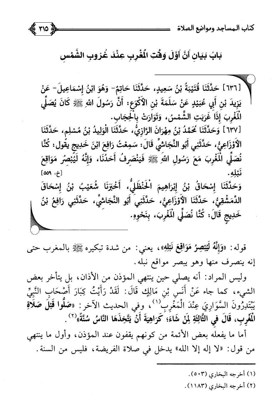 [٦٣٦] حَدَّثَنَا قُتَيْبَةُ بْنُ سَعِيدٍ، حَدَّثَنَا حَاتِمٌ- وَهُوَ ابْنُ إِسْمَاعِيلَ- عَنْ يَزِيدَ بْنِ أَبِي عُبَيْدٍ عَنْ سَلَمَةَ بْنِ الأَكْوَعِ: أَنَّ رَسُولَ اللَّهِ صلى الله عليه وسلم كَانَ يُصَلِّي الْمَغْرِبَ إِذَا غَرَبَتِ الشَّمْسُ، وَتَوَارَتْ بِالْحِجَابِ.