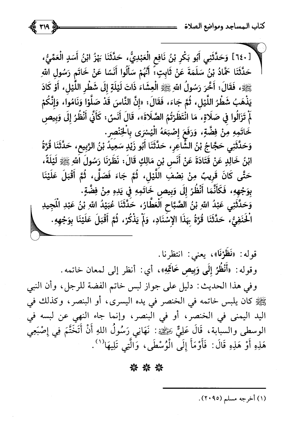 [٦٤٠] وَحَدَّثَنِي أَبُو بَكْرِ بْنُ نَافِعٍ الْعَبْدِيُّ، حَدَّثَنَا بَهْزُ ابْنُ أَسَدٍ الْعَمِّيُّ، حَدَّثَنَا حَمَّادُ بْنُ سَلَمَةَ عَنْ ثَابِتٍ: أَنَّهُمْ سَأَلُوا أَنَسًا عَنْ خَاتَمِ رَسُولِ اللَّهِ صلى الله عليه وسلم، فَقَالَ: أَخَّرَ رَسُولُ اللَّهِ صلى الله عليه وسلم الْعِشَاءَ ذَاتَ لَيْلَةٍ إِلَى شَطْرِ اللَّيْلِ، أَوْ كَادَ يَذْهَبُ شَطْرُ اللَّيْلِ، ثُمَّ جَاءَ، فَقَالَ: ((إِنَّ النَّاسَ قَدْ صَلَّوْا وَنَامُوا، وَإِنَّكُمْ لَمْ تَزَالُوا فِي صَلَاةٍ، مَا انْتَظَرْتُمُ الصَّلَاةَ))، قَالَ أَنَسٌ: كَأَنِّي أَنْظُرُ إِلَى وَبِيصِ خَاتَمِهِ مِنْ فِضَّةٍ، وَرَفَعَ إِصْبَعَهُ الْيُسْرَى بِالْخِنْصِرِ.