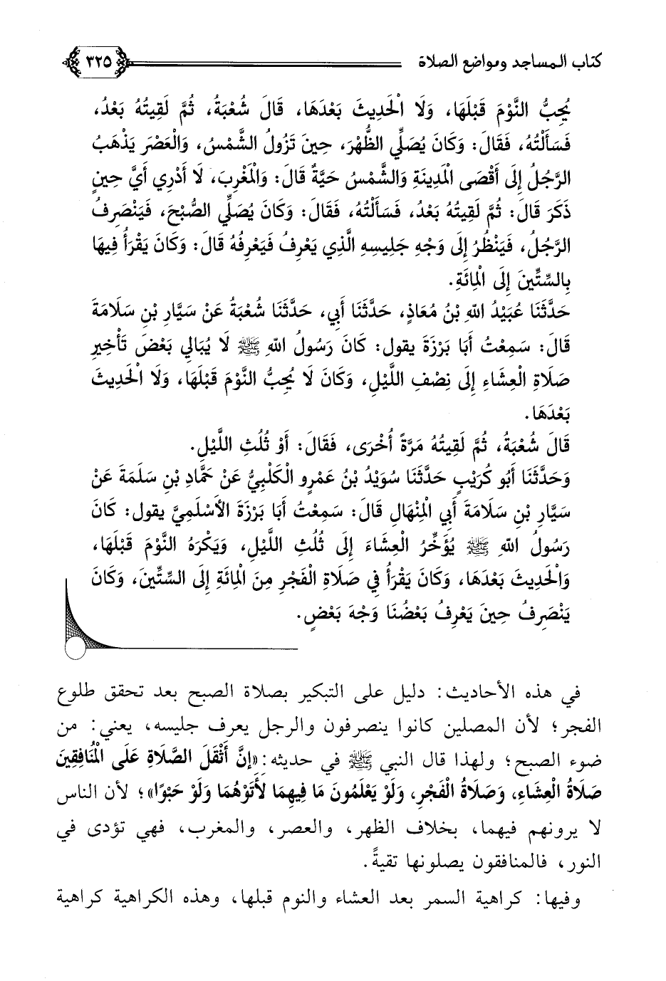 يُحِبُّ النَّوْمَ قَبْلَهَا، وَلَا الْحَدِيثَ بَعْدَهَا، قَالَ شُعْبَةُ، ثُمَّ لَقِيتُهُ بَعْدُ، فَسَأَلْتُهُ، فَقَالَ: وَكَانَ يُصَلِّي الظُّهْرَ، حِينَ تَزُولُ الشَّمْسُ، وَالْعَصْرَ يَذْهَبُ الرَّجُلُ إِلَى أَقْصَى الْمَدِينَةِ وَالشَّمْسُ حَيَّةٌ قَالَ: وَالْمَغْرِبَ، لَا أَدْرِي أَيَّ حِينٍ ذَكَرَ قَالَ: ثُمَّ لَقِيتُهُ بَعْدُ، فَسَأَلْتُهُ، فَقَالَ: وَكَانَ يُصَلِّي الصُّبْحَ، فَيَنْصَرِفُ الرَّجُلُ، فَيَنْظُرُ إِلَى وَجْهِ جَلِيسِهِ الَّذِي يَعْرِفُ فَيَعْرِفُهُ قَالَ: وَكَانَ يَقْرَأُ فِيهَا بِالسِّتِّينَ إِلَى الْمِائَةِ.
