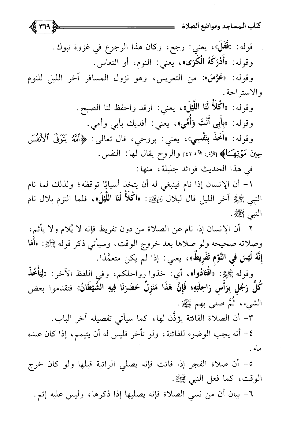 ١ - أن الإنسان إذا نام فينبغي له أن يتخذ أسبابًا توقظه؛ ولذلك لما نام النبي صلى الله عليه وسلم آخر الليل قال لبلال رضي الله عنه: ((اكْلَأْ لَنَا اللَّيْلَ))، فلما التزم بلال نام النبي صلى الله عليه وسلم.