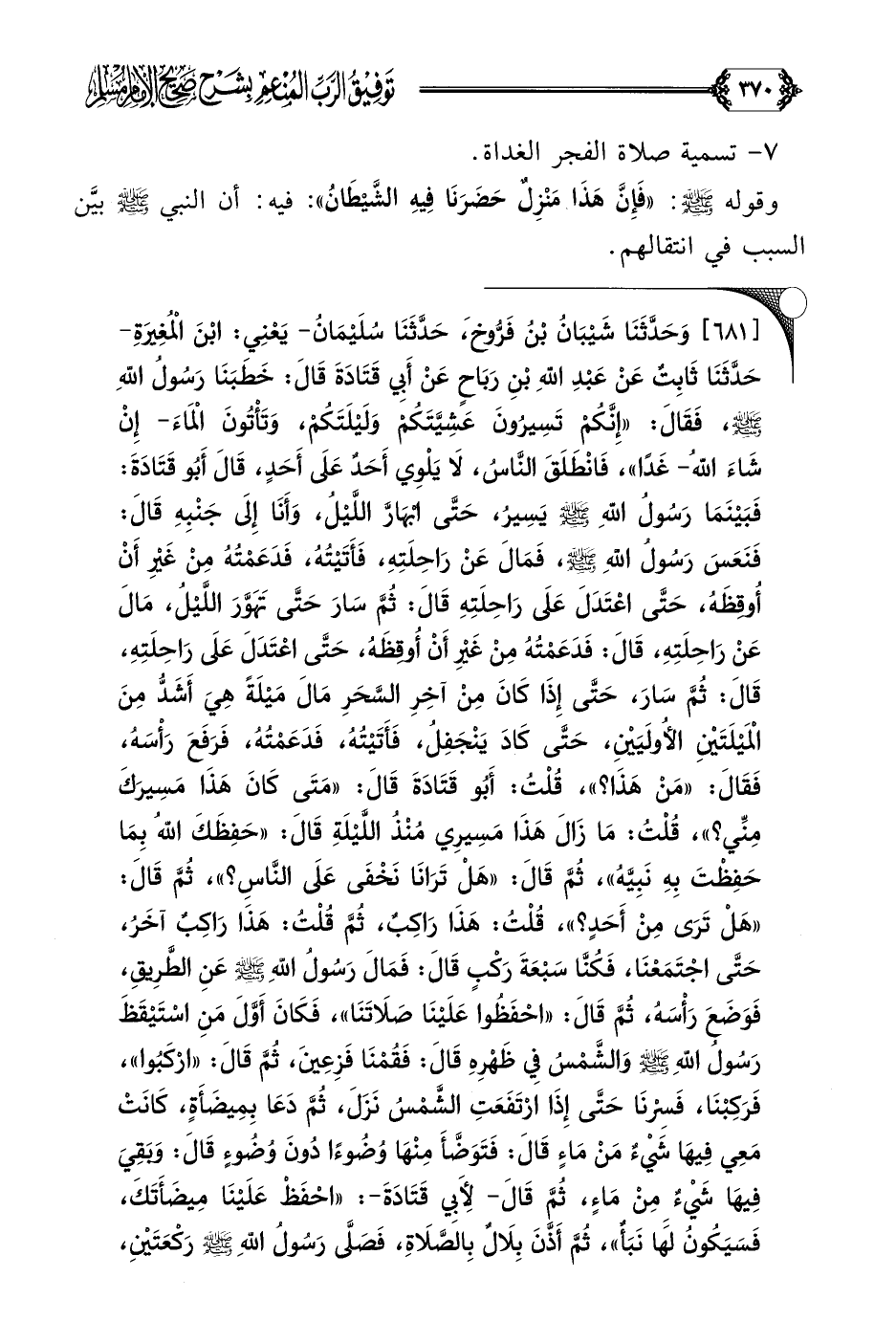 [٦٨١] وَحَدَّثَنَا شَيْبَانُ بْنُ فَرُّوخَ، حَدَّثَنَا سُلَيْمَانُ- يَعْنِي: ابْنَ الْمُغِيرَةِ- حَدَّثَنَا ثَابِتٌ عَنْ عَبْدِ اللَّهِ بْنِ رَبَاحٍ عَنْ أَبِي قَتَادَةَ قَالَ: خَطَبَنَا رَسُولُ اللَّهِ صلى الله عليه وسلم، فَقَالَ: ((إِنَّكُمْ تَسِيرُونَ عَشِيَّتَكُمْ وَلَيْلَتَكُمْ، وَتَأْتُونَ الْمَاءَ- إِنْ شَاءَ اللَّهُ- غَدًا))، فَانْطَلَقَ النَّاسُ، لَا يَلْوِي أَحَدٌ عَلَى أَحَدٍ، قَالَ أَبُو قَتَادَةَ: فَبَيْنَمَا رَسُولُ اللَّهِ صلى الله عليه وسلم يَسِيرُ، حَتَّى ابْهَارَّ اللَّيْلُ، وَأَنَا إِلَى جَنْبِهِ قَالَ: فَنَعَسَ رَسُولُ اللَّهِ صلى الله عليه وسلم، فَمَالَ عَنْ رَاحِلَتِهِ، فَأَتَيْتُهُ، فَدَعَمْتُهُ مِنْ غَيْرِ أَنْ أُوقِظَهُ، حَتَّى اعْتَدَلَ عَلَى رَاحِلَتِهِ قَالَ: ثُمَّ سَارَ حَتَّى تَهَوَّرَ اللَّيْلُ، مَالَ عَنْ رَاحِلَتِهِ قَالَ: فَدَعَمْتُهُ مِنْ غَيْرِ أَنْ أُوقِظَهُ، حَتَّى اعْتَدَلَ عَلَى رَاحِلَتِهِ قَالَ: ثُمَّ سَارَ، حَتَّى إِذَا كَانَ مِنْ آخِرِ السَّحَرِ مَالَ مَيْلَةً هِيَ أَشَدُّ مِنَ الْمَيْلَتَيْنِ الأُولَيَيْنِ، حَتَّى كَادَ يَنْجَفِلُ، فَأَتَيْتُهُ، فَدَعَمْتُهُ، فَرَفَعَ رَأْسَهُ، فَقَالَ: ((مَنْ هَذَا؟ ))، قُلْتُ: أَبُو قَتَادَةَ قَالَ: ((مَتَى كَانَ هَذَا مَسِيرَكَ مِنِّي؟ ))، قُلْتُ: مَا زَالَ هَذَا مَسِيرِي مُنْذُ اللَّيْلَةِ قَالَ: ((حَفِظَكَ اللَّهُ بِمَا حَفِظْتَ بِهِ نَبِيَّهُ))، ثُمَّ قَالَ: ((هَلْ تَرَانَا نَخْفَى عَلَى النَّاسِ؟ ))، ثُمَّ قَالَ: ((هَلْ تَرَى مِنْ أَحَدٍ؟ ))، قُلْتُ: هَذَا رَاكِبٌ، ثُمَّ قُلْتُ: هَذَا رَاكِبٌ آخَرُ، حَتَّى اجْتَمَعْنَا، فَكُنَّا سَبْعَةَ رَكْبٍ قَالَ: فَمَالَ رَسُولُ اللَّهِ صلى الله عليه وسلم عَنِ الطَّرِيقِ، فَوَضَعَ رَأْسَهُ، ثُمَّ قَالَ: ((احْفَظُوا عَلَيْنَا صَلَاتَنَا))، فَكَانَ أَوَّلَ