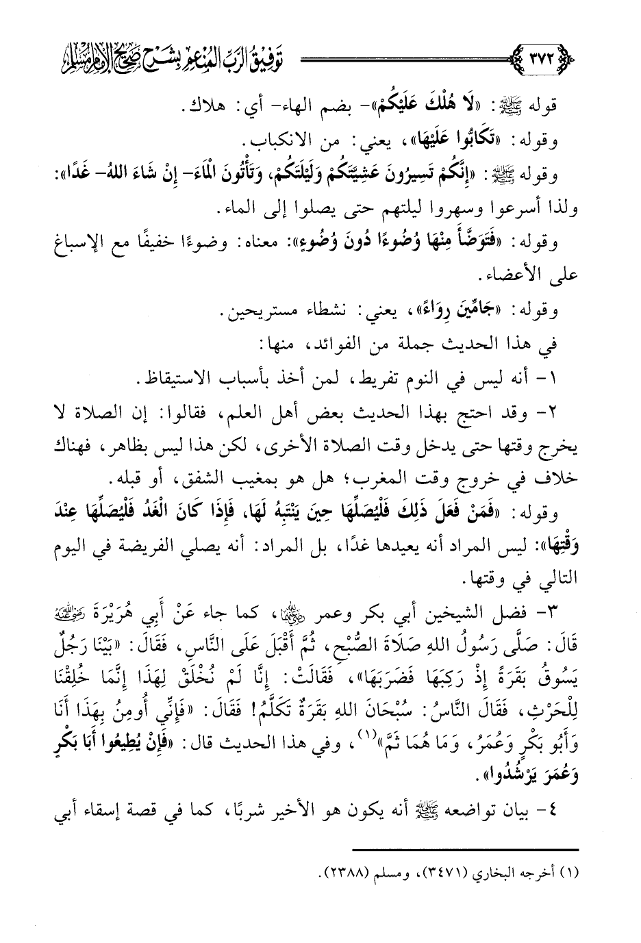 وقوله صلى الله عليه وسلم: ((إِنَّكُمْ تَسِيرُونَ عَشِيَّتَكُمْ وَلَيْلَتَكُمْ، وَتَأْتُونَ الْمَاءَ- إِنْ شَاءَ اللَّهُ- غَدًا)) ولذا أسرعوا وسهروا ليلتهم حتى يصلوا إلى الماء.
