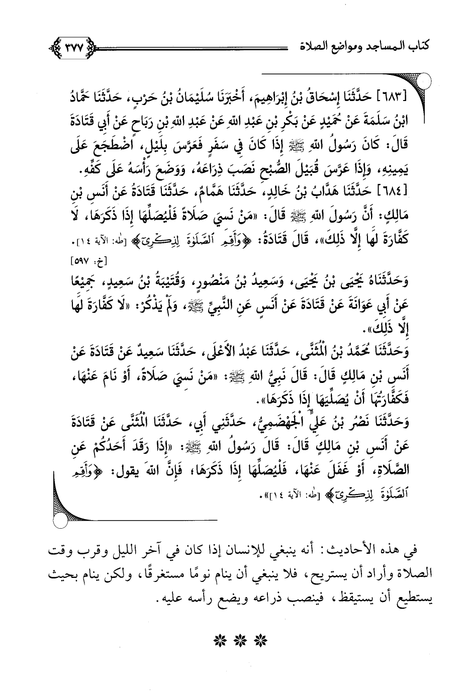 [٦٨٤] حَدَّثَنَا هَدَّابُ بْنُ خَالِدٍ، حَدَّثَنَا هَمَّامٌ، حَدَّثَنَا قَتَادَةُ عَنْ أَنَسِ بْنِ مَالِكٍ: أَنَّ رَسُولَ اللَّهِ صلى الله عليه وسلم قَالَ: ((مَنْ نَسِيَ صَلَاةً فَلْيُصَلِّهَا إِذَا ذَكَرَهَا، لَا كَفَّارَةَ لَهَا إِلَّا ذَلِكَ))، قَالَ قَتَادَةُ: {وَأَقِمِ الصَّلَاةَ لِذِكْرِي}.