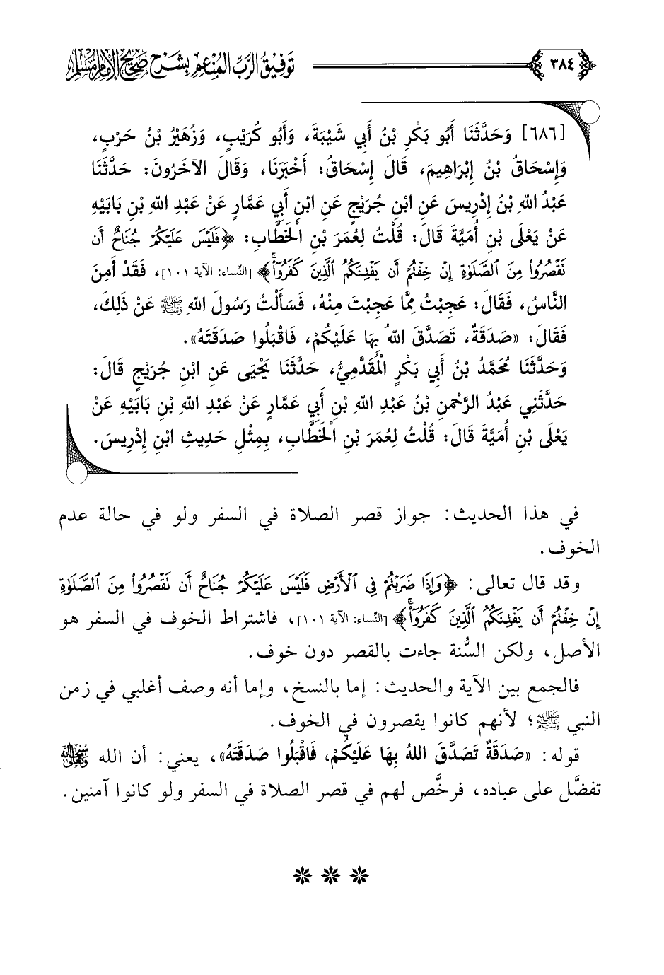 [٦٨٦] وَحَدَّثَنَا أَبُو بَكْرِ بْنُ أَبِي شَيْبَةَ، وَأَبُو كُرَيْبٍ، وَزُهَيْرُ بْنُ حَرْبٍ، وَإِسْحَاقُ بْنُ إِبْرَاهِيمَ، قَالَ إِسْحَاقُ: أَخْبَرَنَا، وَقَالَ الآخَرُونَ: حَدَّثَنَا عَبْدُ اللَّهِ بْنُ إِدْرِيسَ عَنِ ابْنِ جُرَيْجٍ عَنِ ابْنِ أَبِي عَمَّارٍ عَنْ عَبْدِ اللَّهِ بْنِ بَابَيْهِ عَنْ يَعْلَى ابْنِ أُمَيَّةَ قَالَ: قُلْتُ لِعُمَرَ بْنِ الْخَطَّابِ: {فَلَيْسَ عَلَيْكُمْ جُنَاحٌ أَنْ تَقْصُرُوا مِنَ الصَّلاةِ إِنْ خِفْتُمْ أَنْ يَفْتِنَكُمُ الَّذِينَ كَفَرُوا}، فَقَدْ أَمِنَ النَّاسُ، فَقَالَ: عَجِبْتُ مِمَّا عَجِبْتَ مِنْهُ، فَسَأَلْتُ رَسُولَ اللَّهِ صلى الله عليه وسلم عَنْ ذَلِكَ، فَقَالَ: ((صَدَقَةٌ، تَصَدَّقَ اللَّهُ بِهَا عَلَيْكُمْ، فَاقْبَلُوا صَدَقَتَهُ)).