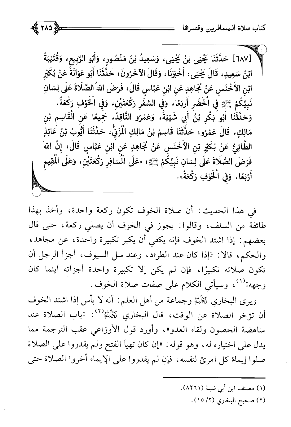 وَحَدَّثَنَا أَبُو بَكْرِ بْنُ أَبِي شَيْبَةَ، وَعَمْرٌو النَّاقِدُ، جَمِيعًا عَنِ الْقَاسِمِ بْنِ مَالِكٍ، قَالَ عَمْرٌو: حَدَّثَنَا قَاسِمُ بْنُ مَالِكٍ الْمُزَنِيُّ، حَدَّثَنَا أَيُّوبُ بْنُ عَائِذٍ الطَّائِيُّ عَنْ بُكَيْرِ بْنِ الأَخْنَسِ عَنْ مُجَاهِدٍ عَنِ ابْنِ عَبَّاسٍ قَالَ: إِنَّ اللَّهَ فَرَضَ الصَّلَاةَ عَلَى لِسَانِ نَبِيِّكُمْ صلى الله عليه وسلم: ((عَلَى الْمُسَافِرِ رَكْعَتَيْنِ، وَعَلَى الْمُقِيمِ أَرْبَعًا، وَفِي الْخَوْفِ رَكْعَةً)).