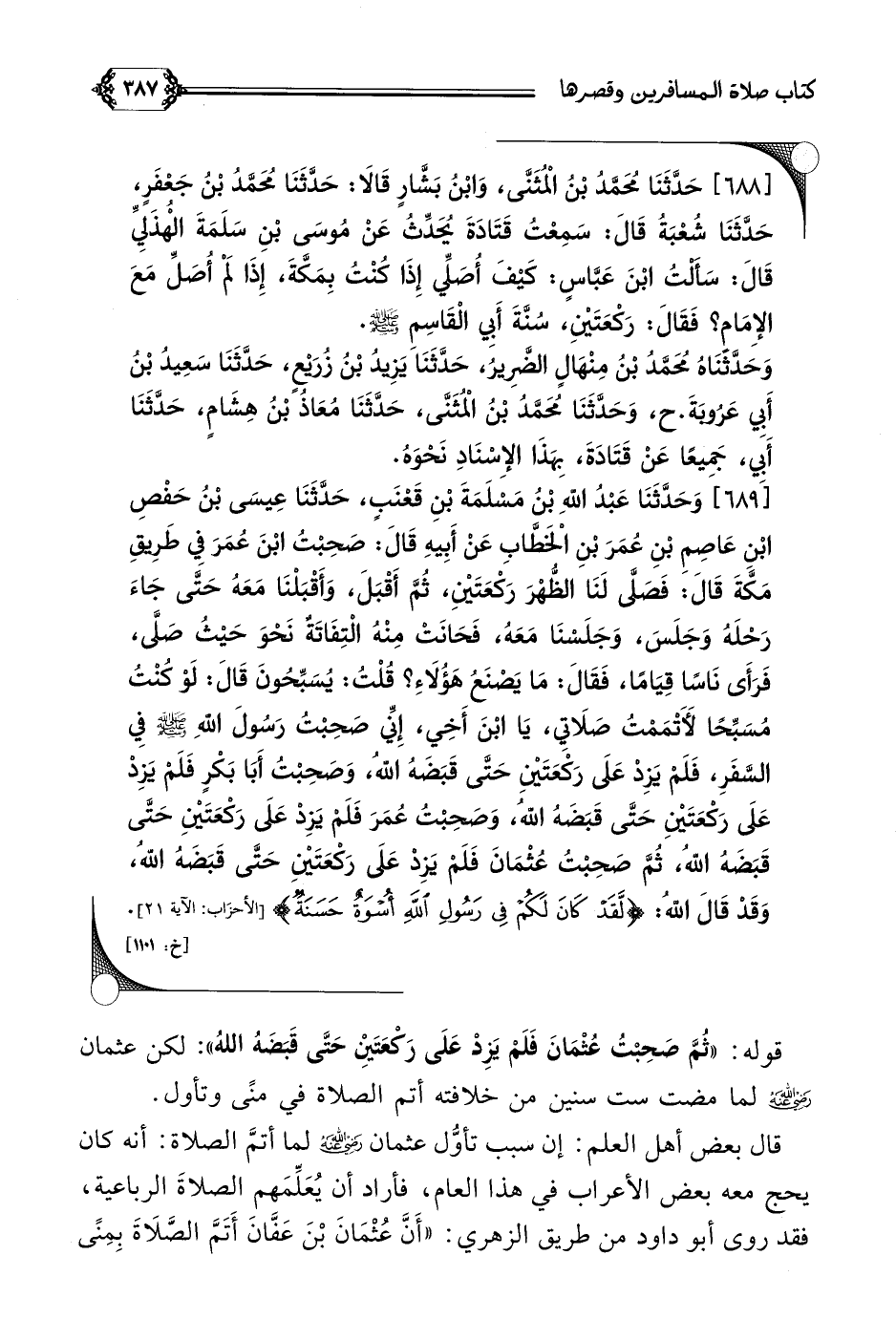 [٦٨٩] وَحَدَّثَنَا عَبْدُ اللَّهِ بْنُ مَسْلَمَةَ بْنِ قَعْنَبٍ، حَدَّثَنَا عِيسَى بْنُ حَفْصِ بْنِ عَاصِمِ بْنِ عُمَرَ بْنِ الْخَطَّابِ عَنْ أَبِيهِ قَالَ: صَحِبْتُ ابْنَ عُمَرَ فِي طَرِيقِ مَكَّةَ قَالَ: فَصَلَّى لَنَا الظُّهْرَ رَكْعَتَيْنِ، ثُمَّ أَقْبَلَ، وَأَقْبَلْنَا مَعَهُ حَتَّى جَاءَ رَحْلَهُ وَجَلَسَ، وَجَلَسْنَا مَعَهُ، فَحَانَتْ مِنْهُ الْتِفَاتَةٌ نَحْوَ حَيْثُ صَلَّى، فَرَأَى نَاسًا قِيَامًا، فَقَالَ: مَا يَصْنَعُ هَؤُلَاءِ؟ قُلْتُ: يُسَبِّحُونَ قَالَ: لَوْ كُنْتُ مُسَبِّحًا لَأَتْمَمْتُ صَلَاتِي، يَا ابْنَ أَخِي، إِنِّي صَحِبْتُ رَسُولَ اللَّهِ صلى الله عليه وسلم فِي السَّفَرِ، فَلَمْ يَزِدْ عَلَى رَكْعَتَيْنِ حَتَّى قَبَضَهُ اللَّهُ، وَصَحِبْتُ أَبَا بَكْرٍ فَلَمْ يَزِدْ عَلَى رَكْعَتَيْنِ حَتَّى قَبَضَهُ اللَّهُ، وَصَحِبْتُ عُمَرَ فَلَمْ يَزِدْ عَلَى رَكْعَتَيْنِ حَتَّى قَبَضَهُ اللَّهُ، ثُمَّ صَحِبْتُ عُثْمَانَ فَلَمْ يَزِدْ عَلَى رَكْعَتَيْنِ حَتَّى قَبَضَهُ اللَّهُ، وَقَدْ قَالَ اللَّهُ: {لَقَدْ كَانَ لَكُمْ فِي رَسُولِ اللَّهِ أُسْوَةٌ حَسَنَةٌ}.