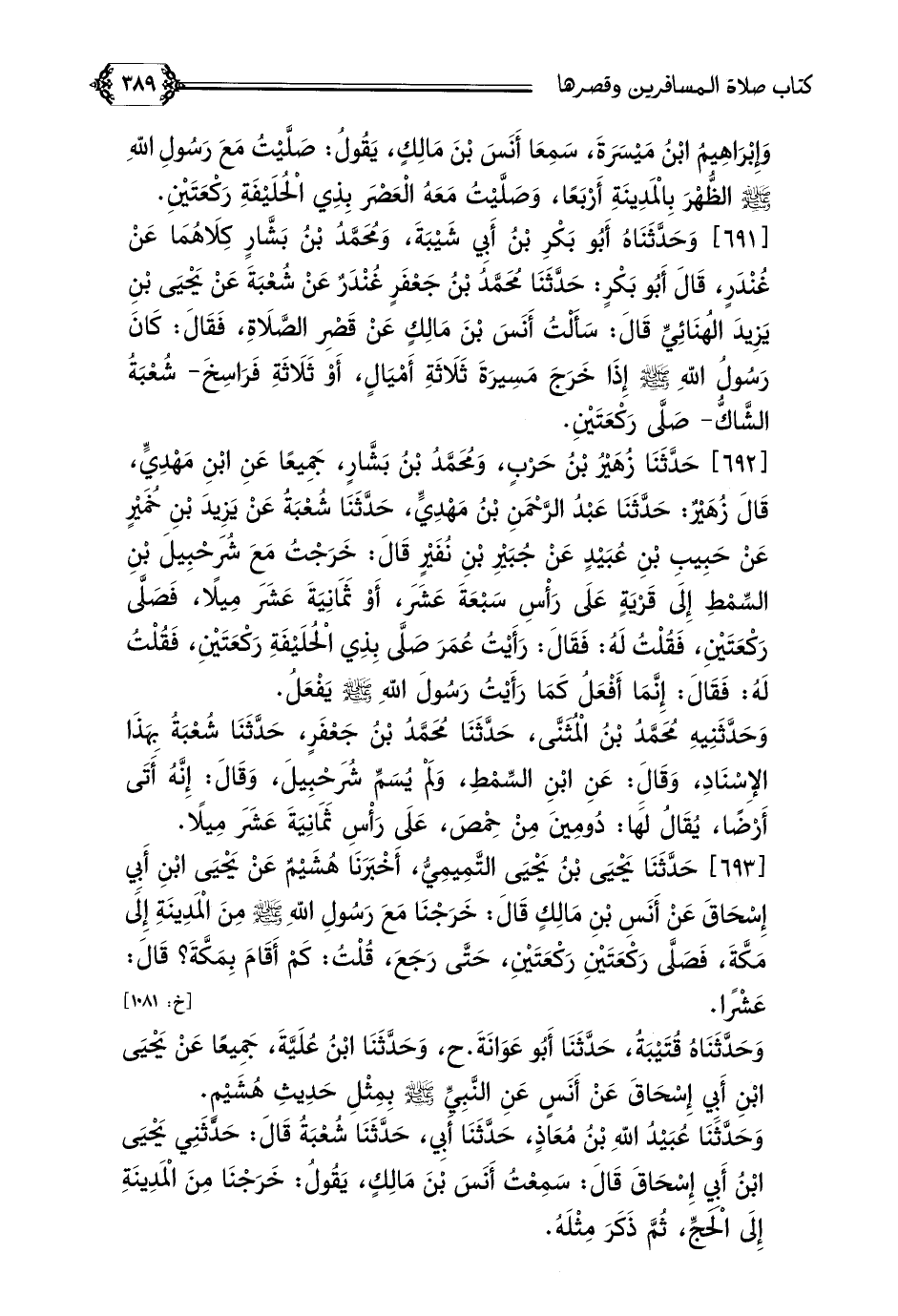 [٦٩١] وَحَدَّثَنَاهُ أَبُو بَكْرِ بْنُ أَبِي شَيْبَةَ، وَمُحَمَّدُ بْنُ بَشَّارٍ كِلَاهُمَا عَنْ غُنْدَرٍ، قَالَ أَبُو بَكْرٍ: حَدَّثَنَا مُحَمَّدُ بْنُ جَعْفَرٍ غُنْدَرٌ عَنْ شُعْبَةَ عَنْ يَحْيَى بْنِ يَزِيدَ الْهُنَائِيِّ قَالَ: سَأَلْتُ أَنَسَ بْنَ مَالِكٍ عَنْ قَصْرِ الصَّلَاةِ، فَقَالَ: كَانَ رَسُولُ اللَّهِ صلى الله عليه وسلم إِذَا خَرَجَ مَسِيرَةَ ثَلَاثَةِ أَمْيَالٍ، أَوْ ثَلَاثَةِ فَرَاسِخَ- شُعْبَةُ الشَّاكُّ- صَلَّى رَكْعَتَيْنِ.
